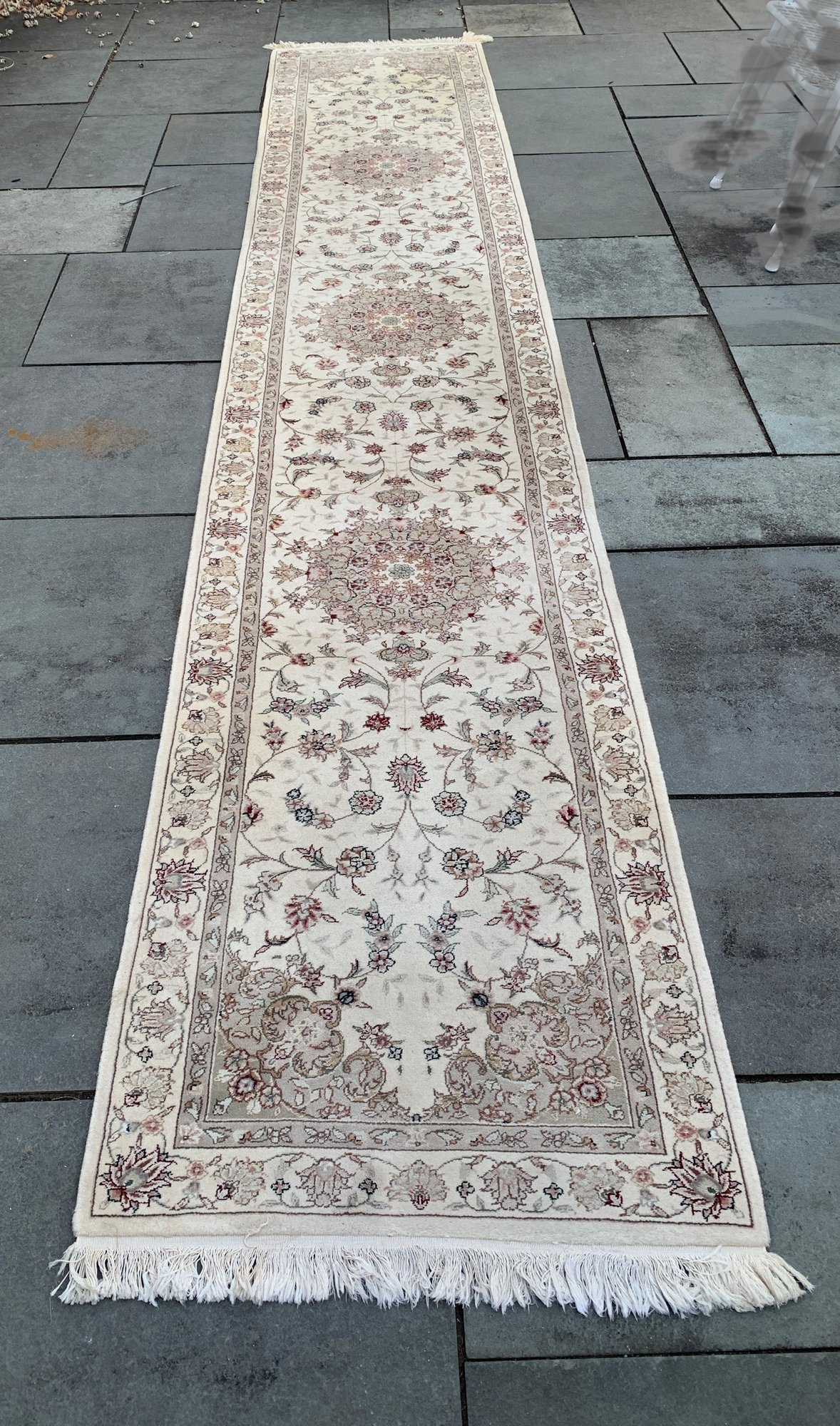 The rug measures 102” X 28”, and is in excellent condition. The rug was purchased approximately 35 years ago and has had virtually no wear.
