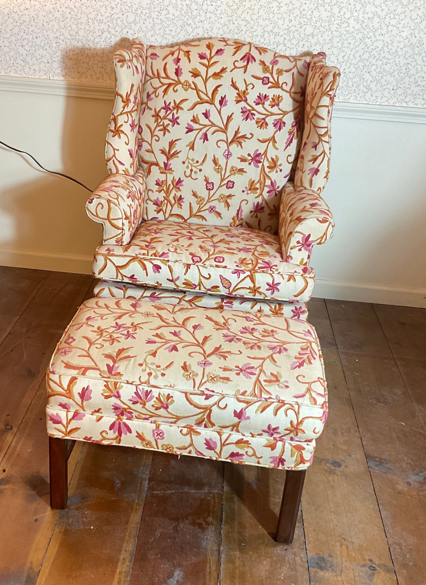Here is a nice substantial wheelchair and matching ottoman from the Hickory Chair company, North Carolina. The material is a salmon colored, cruel on a white linen background. The wood is solid mahogany. Great Quality,