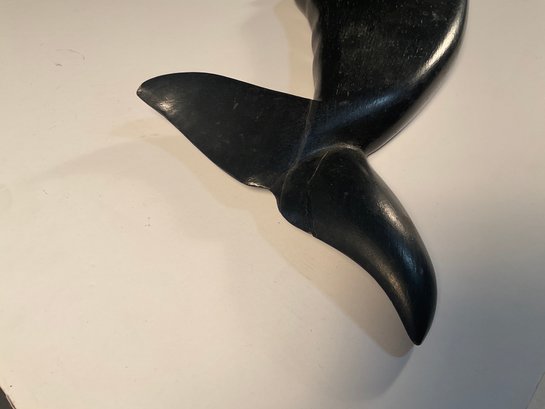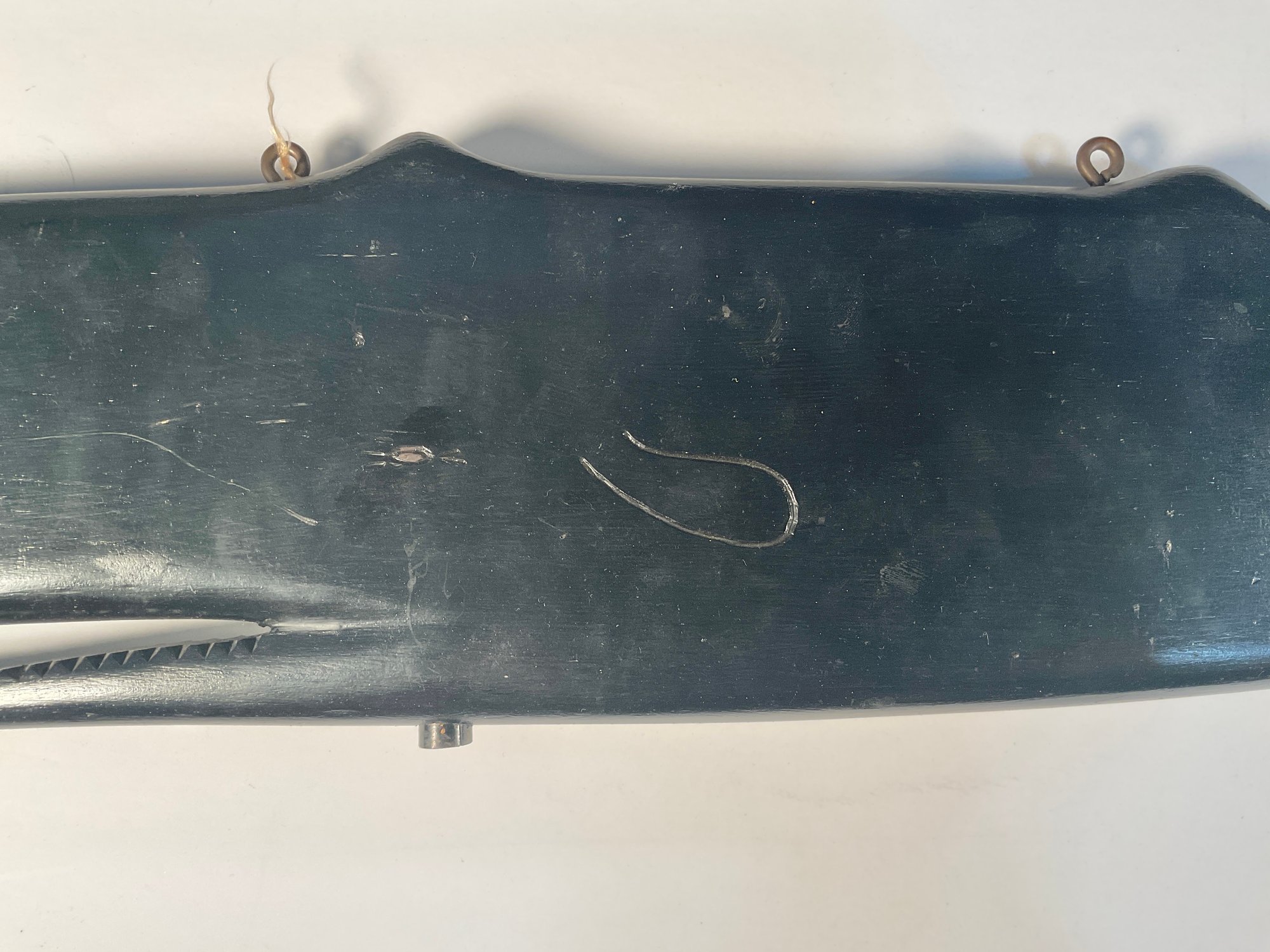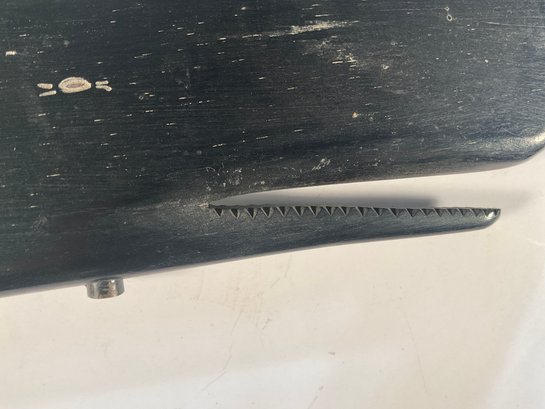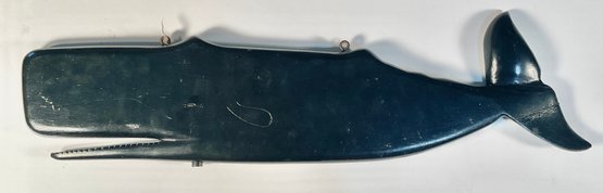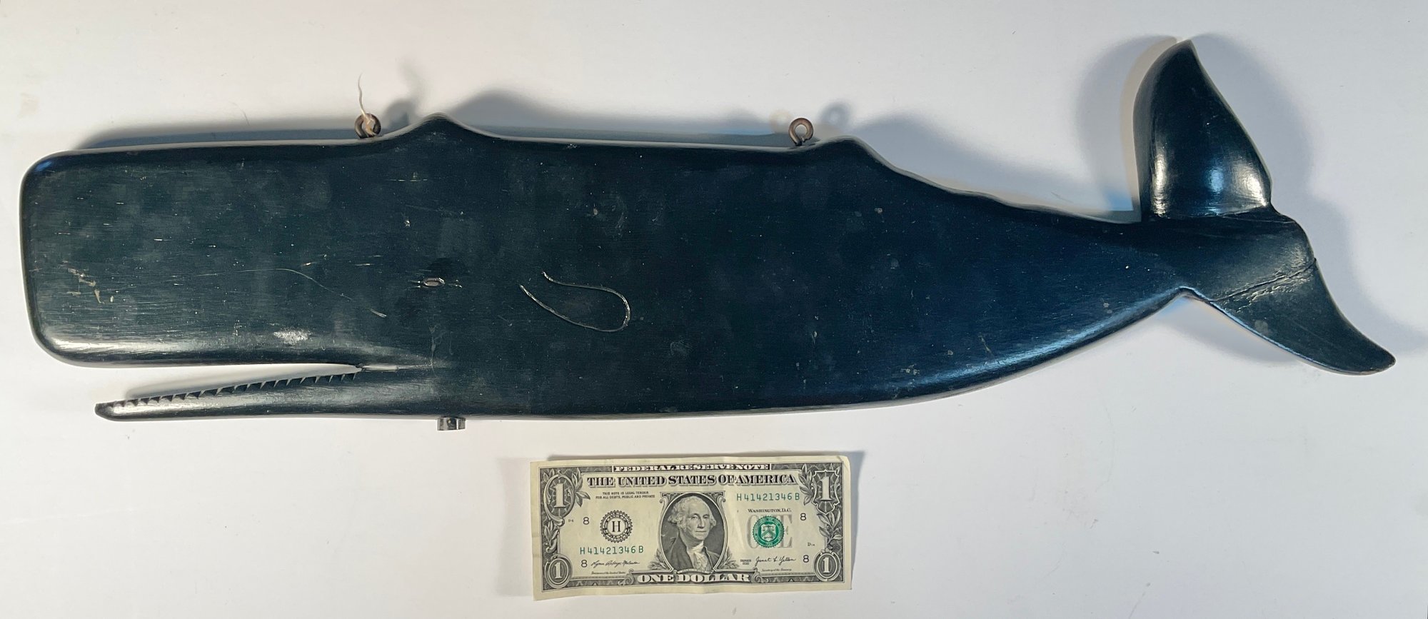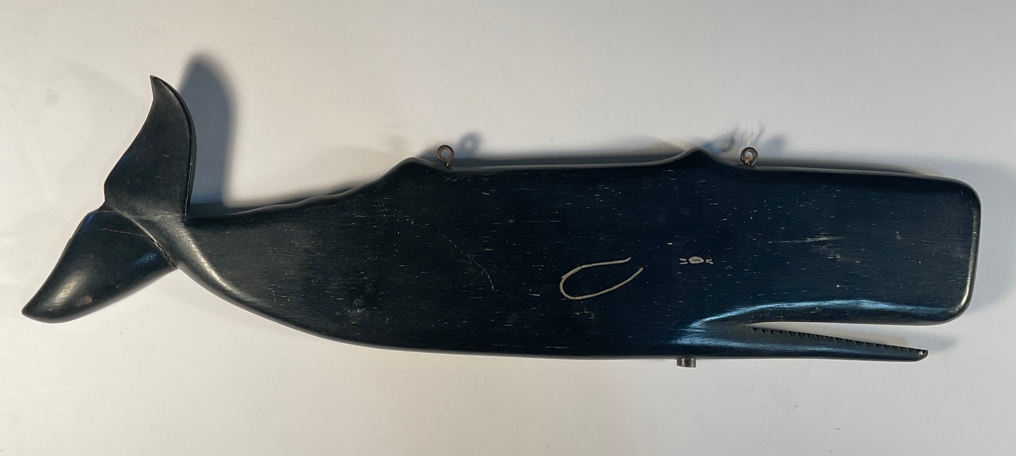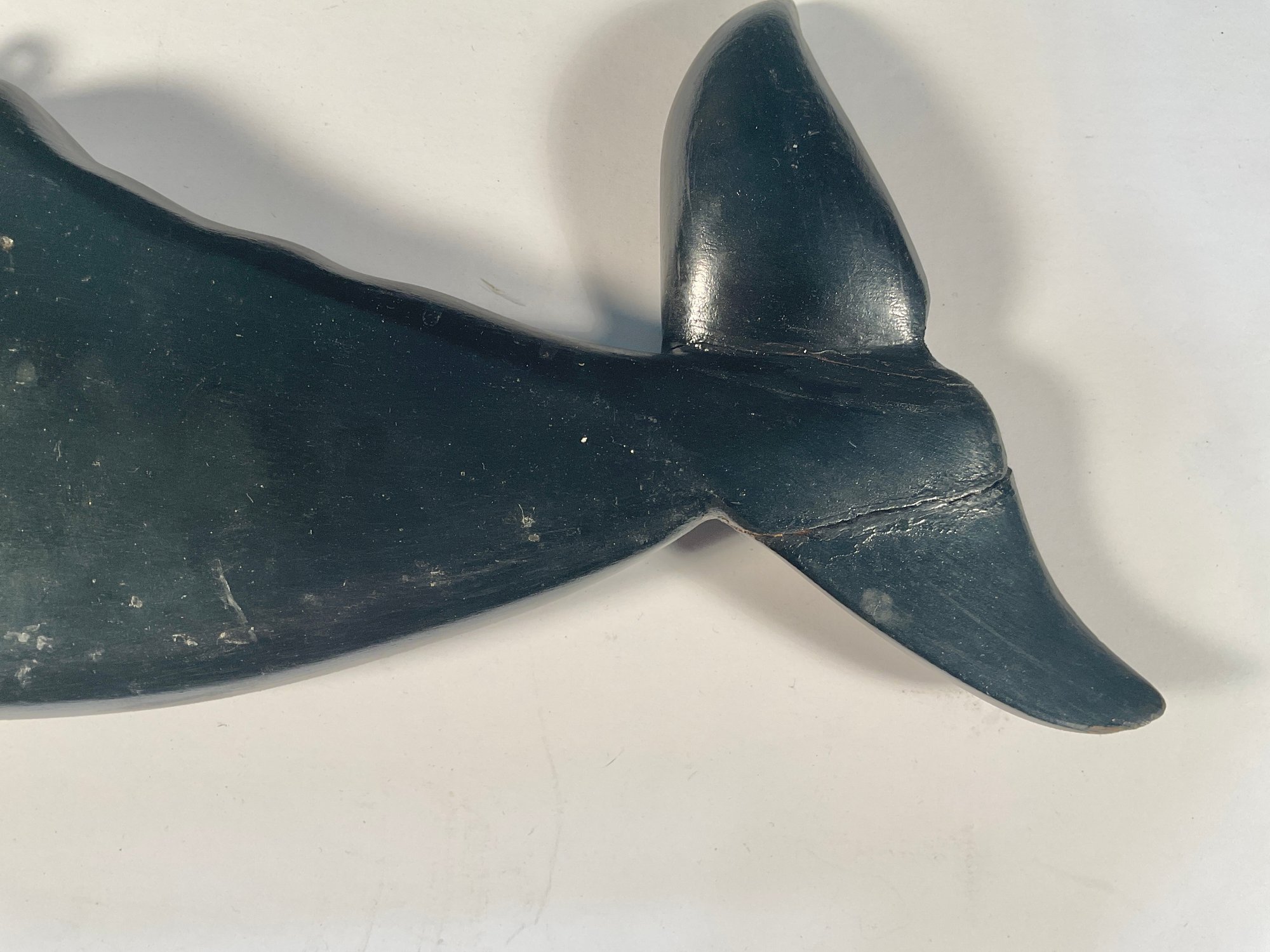Removed from the estate where it was hanging for over 45 years. It is attributed to Joe Johnson, who was a carver in Westbrook Connecticut and lived on Wesley Avenue. He stopped making ship with veins and whales just about 35 years ago. This was never outside. It was always hung on a wall inside the house