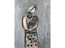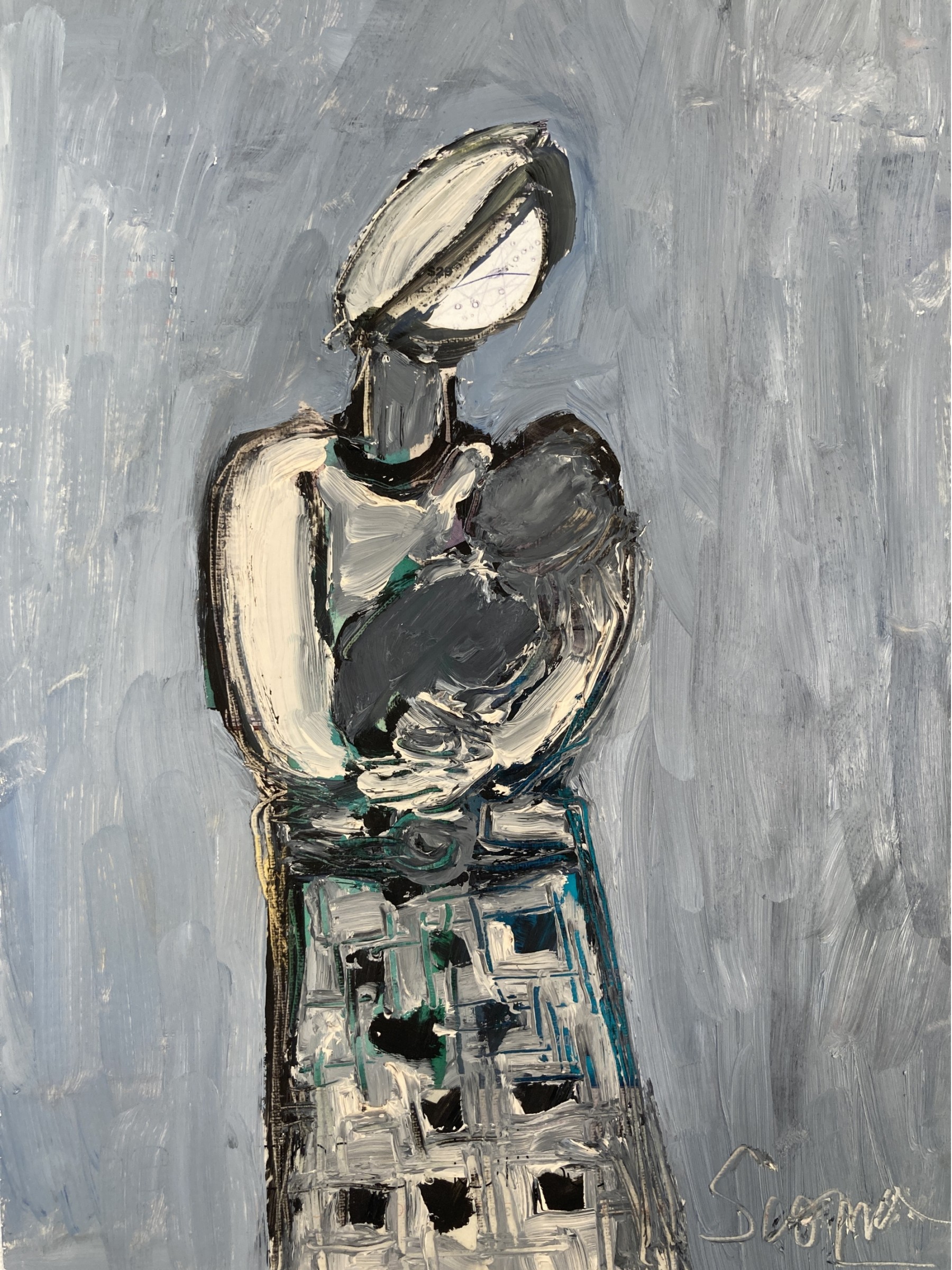 Selling an original Joe Scoppa oil painting on magazine paper featuring an abstract female figure with baby on blue/gray background. Signed lower right. Comes with a bio sheet of the artist. Loose artwork.