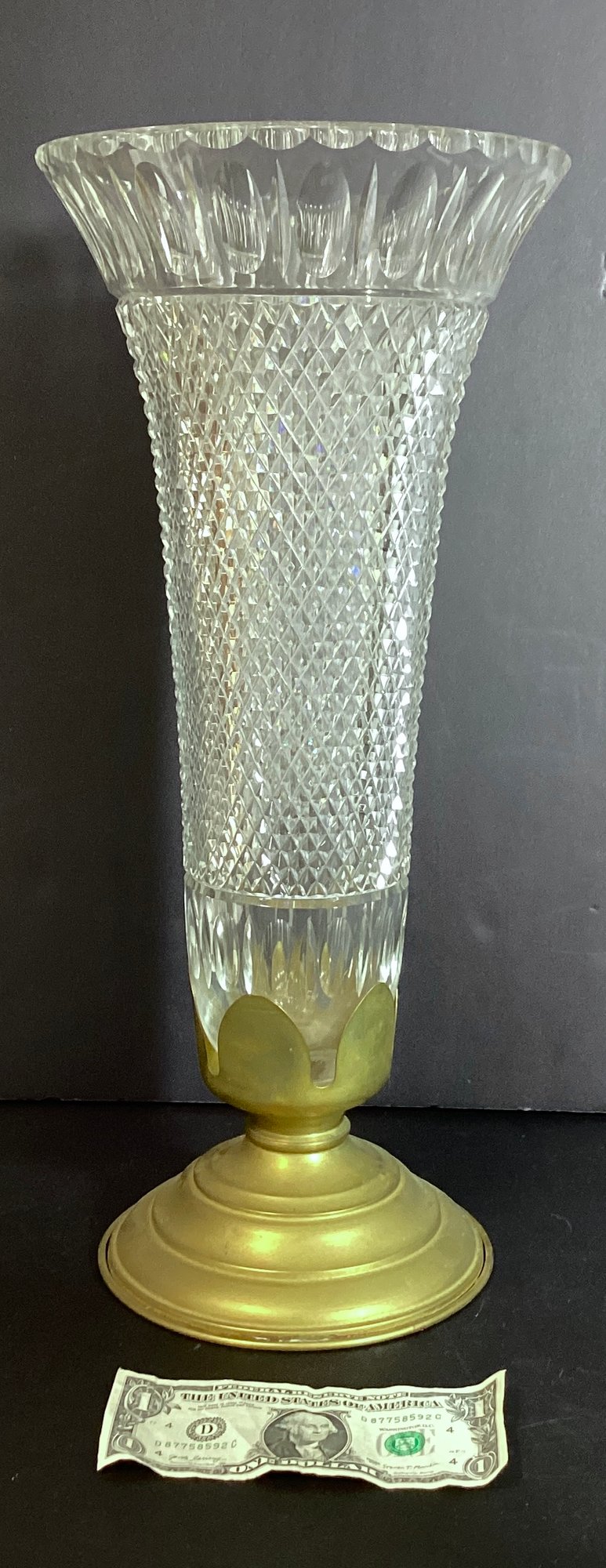 Here we have a great large crystal vase that has a brass base.
