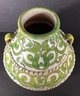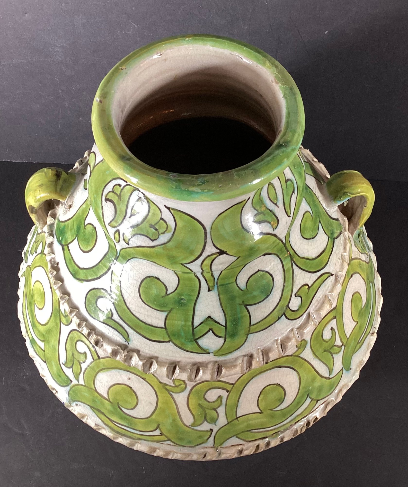 This jar is crafted of terracotta and has a green design undulating over a white background.
