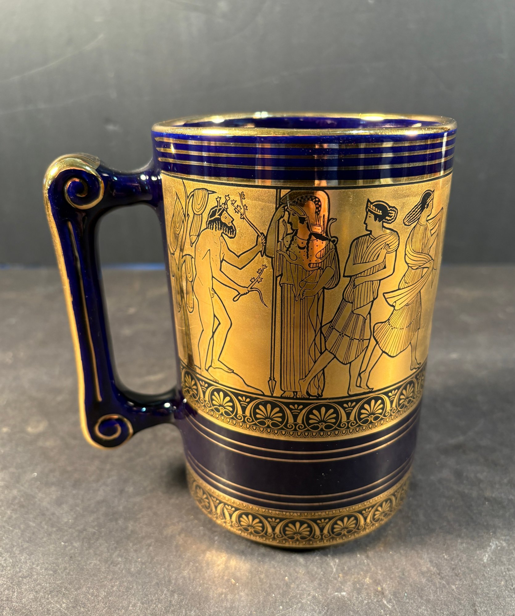 This has been designed with 24 kit. Gold, and has birds, columns, and people in a classical design surrounding the mug.