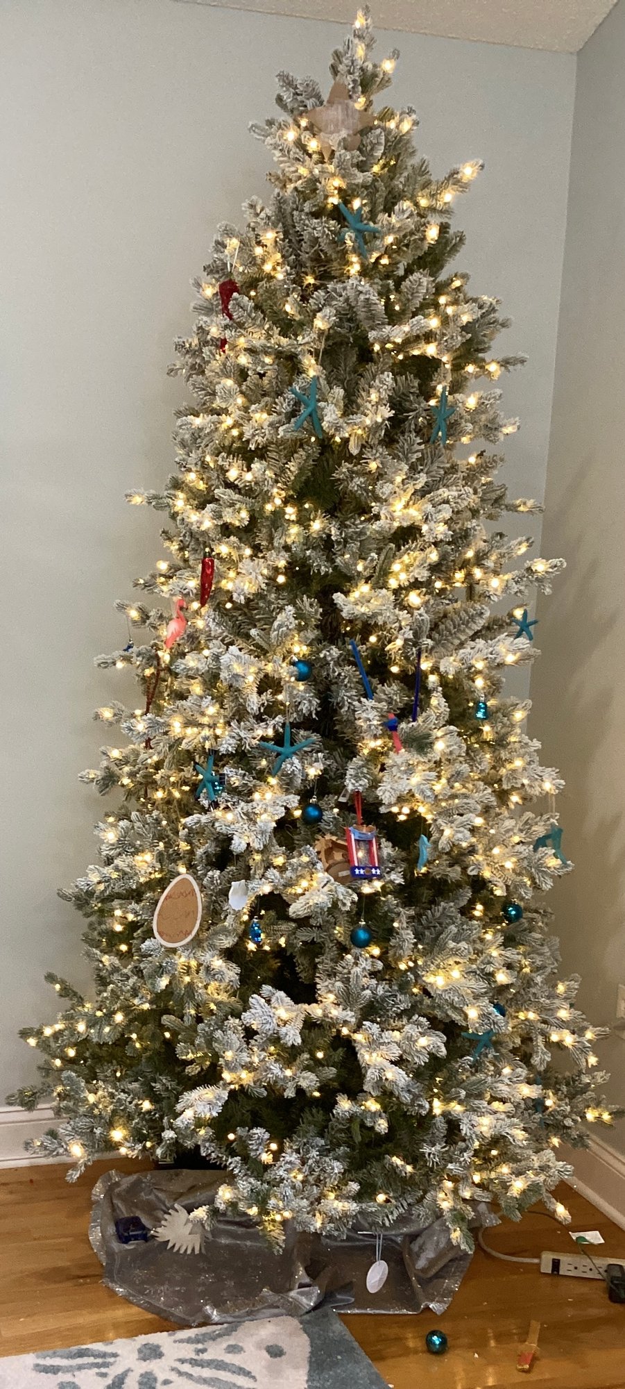 This comes with ornaments including faux starfish, flamingo, blue glass Christmas balls, etc. ORIGINAL COST $299.00