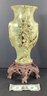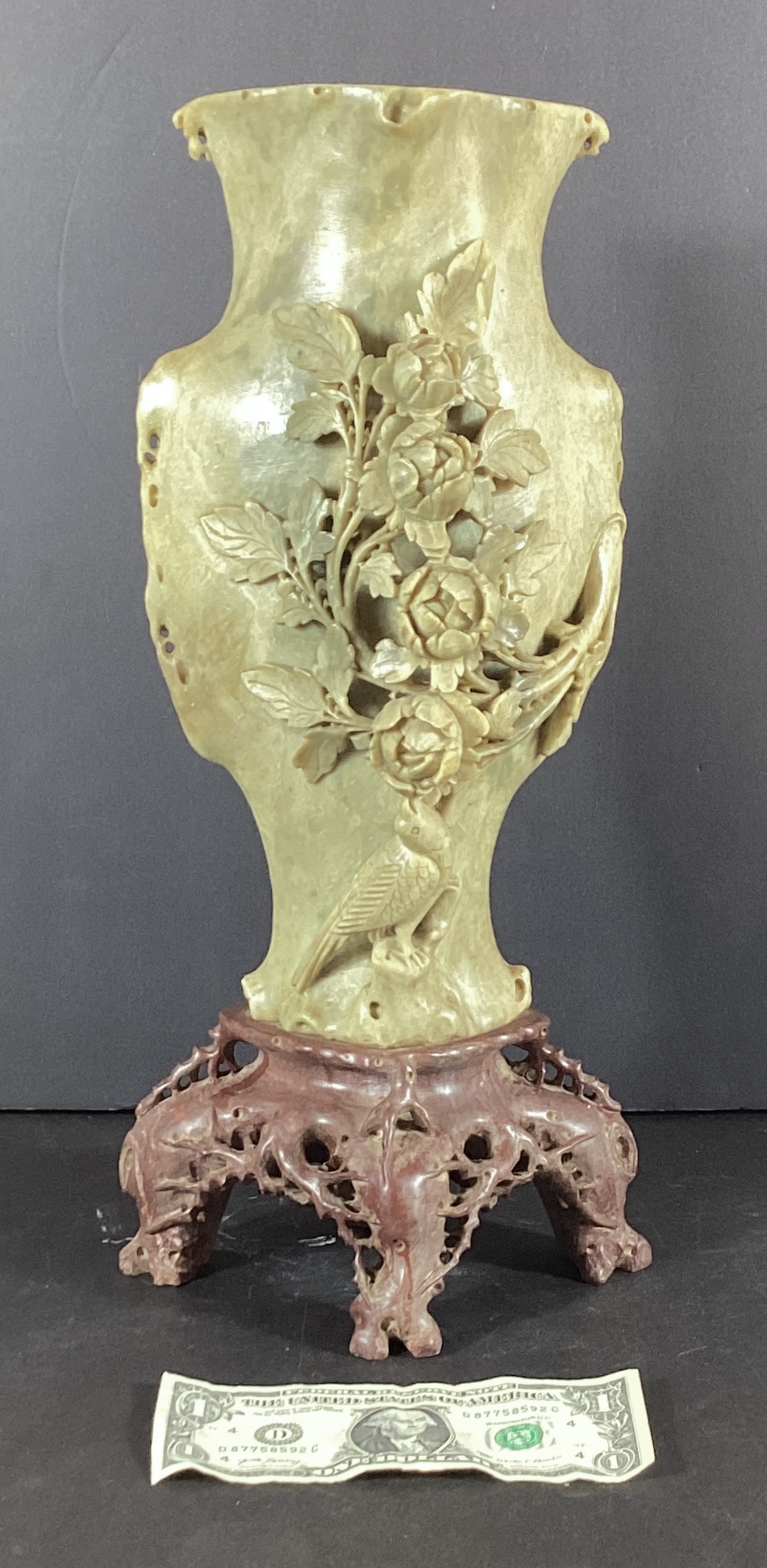 Wow! Here we have a large intracately hand carved Asian soapstone vase that has carved flowers, branches, and a bird. The base of the vase is carved brown soapstone, fashioned to resemble twigs and branches.