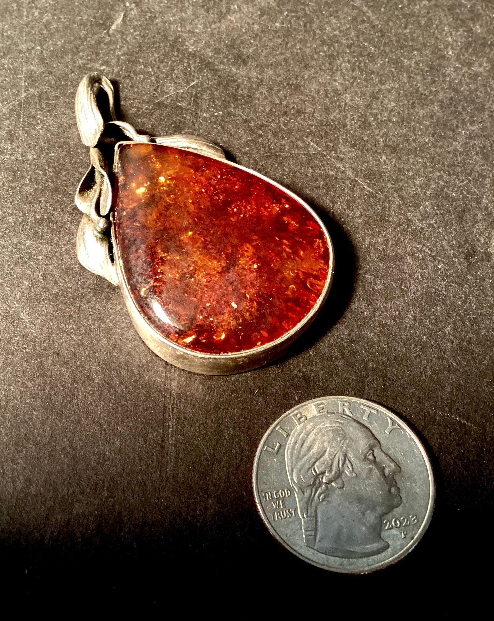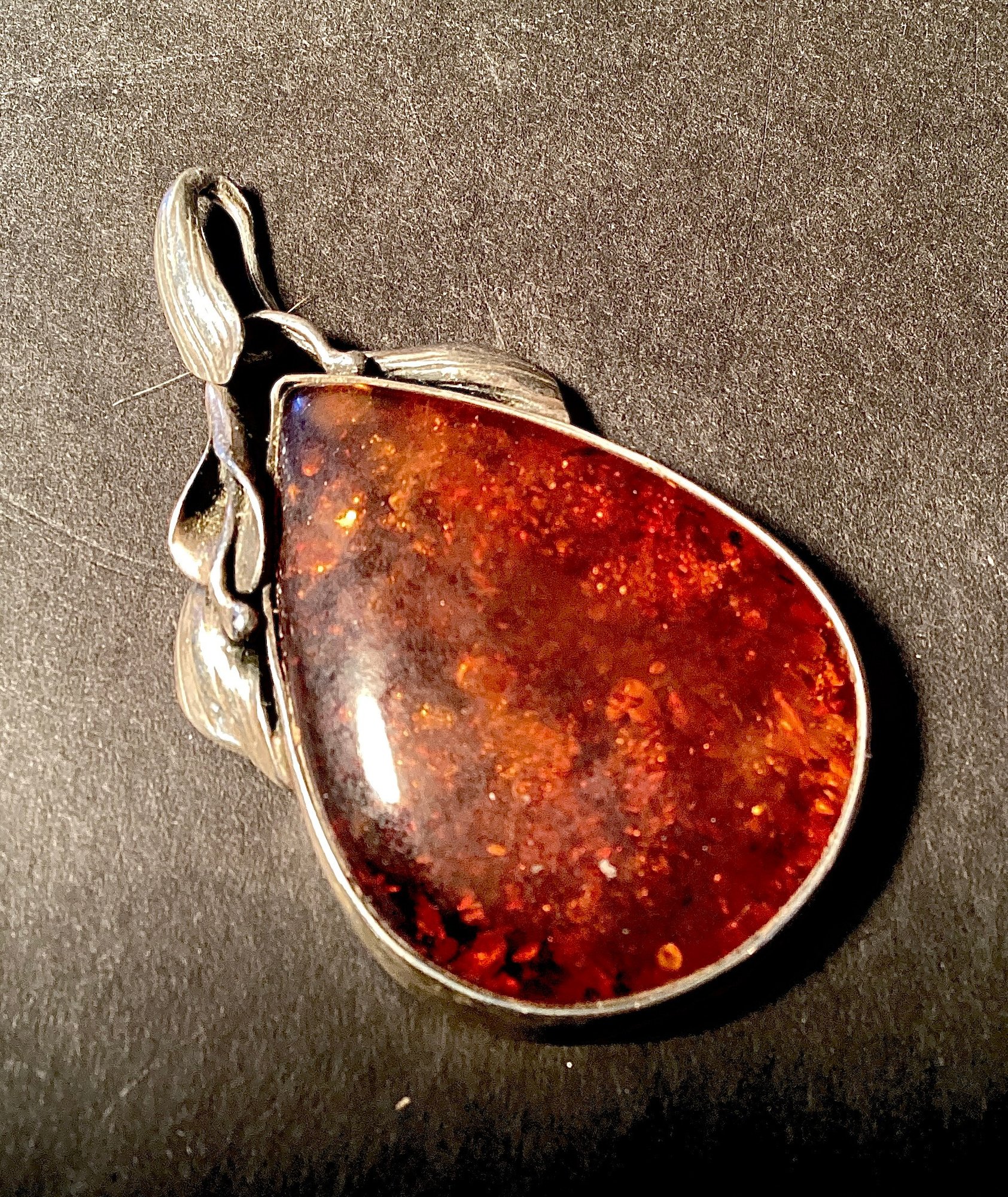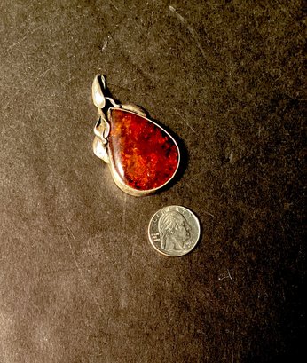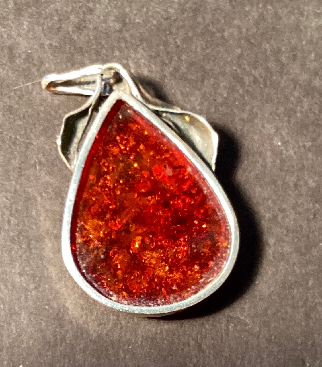 Beautiful amber pendant in a large teardrop shape bezel set in sterling silver with bale.