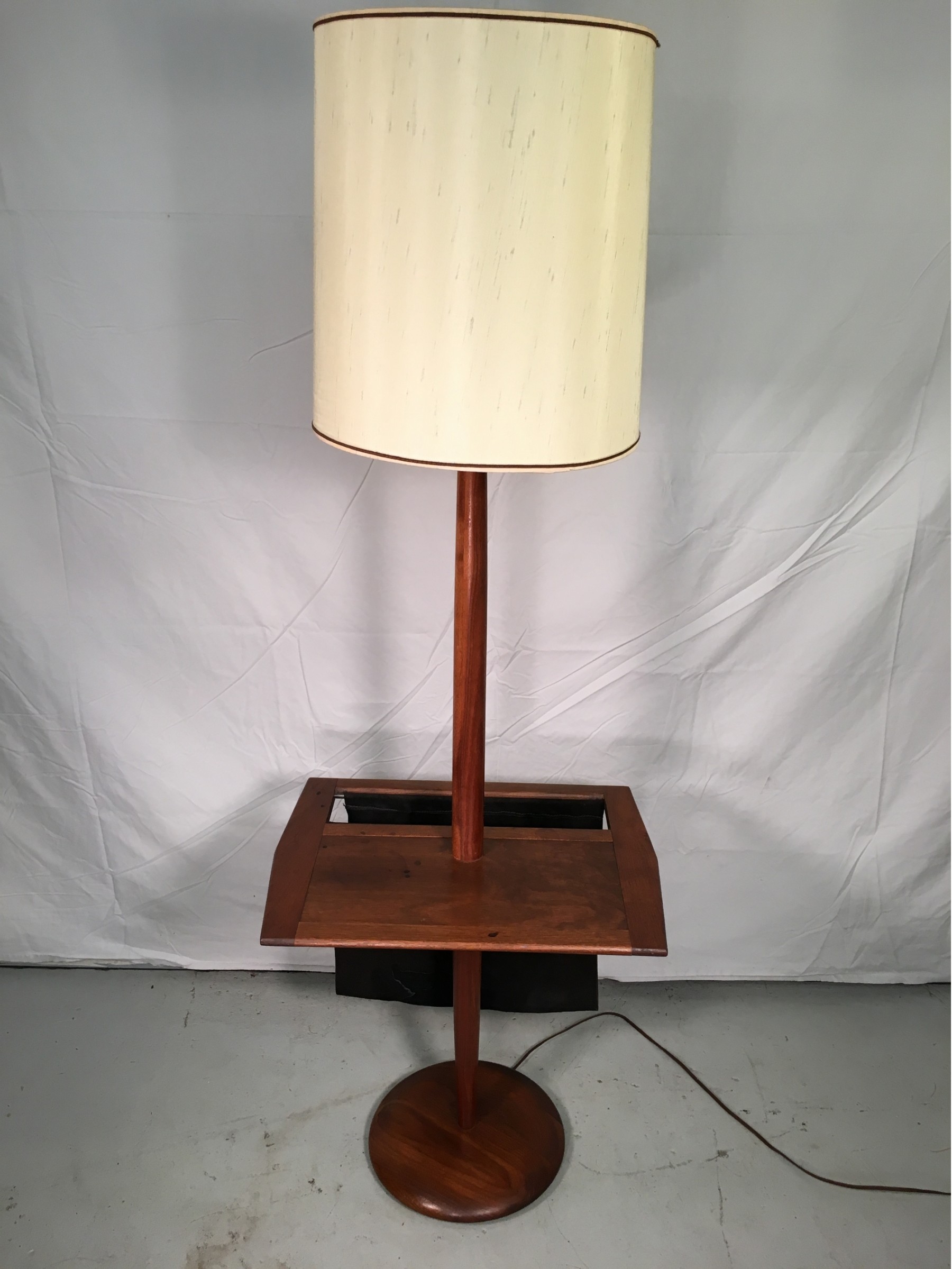 Selling a mid-century era Laurel lamp co. walnut floor lamp with table and suede magazine rack. C. 1960s.