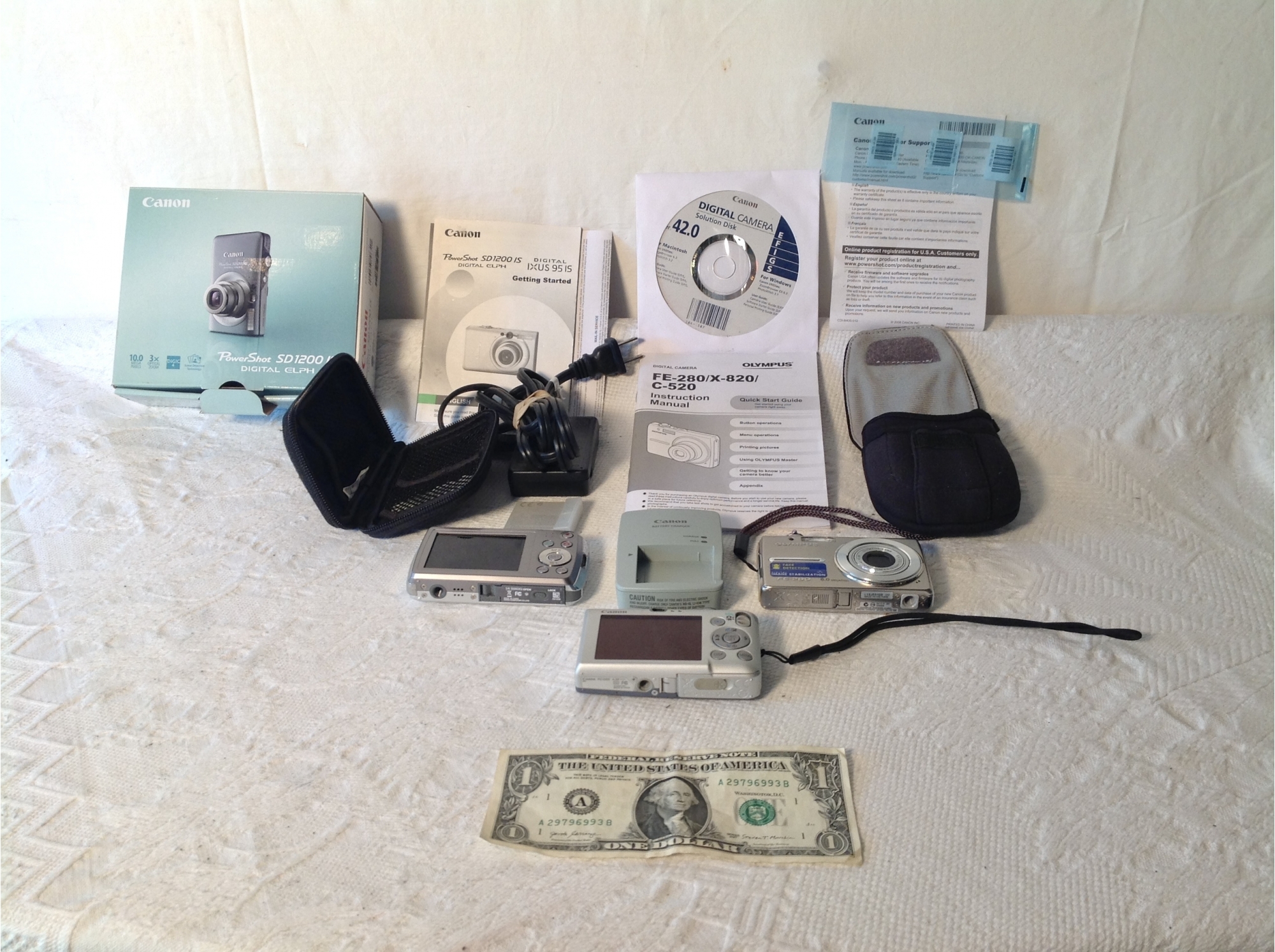 Three separate cameras, Casio Exlim with 3x lens and charger, Cannon Power Shot Elph with Charger, Olympus FE- 280. No condition report available .