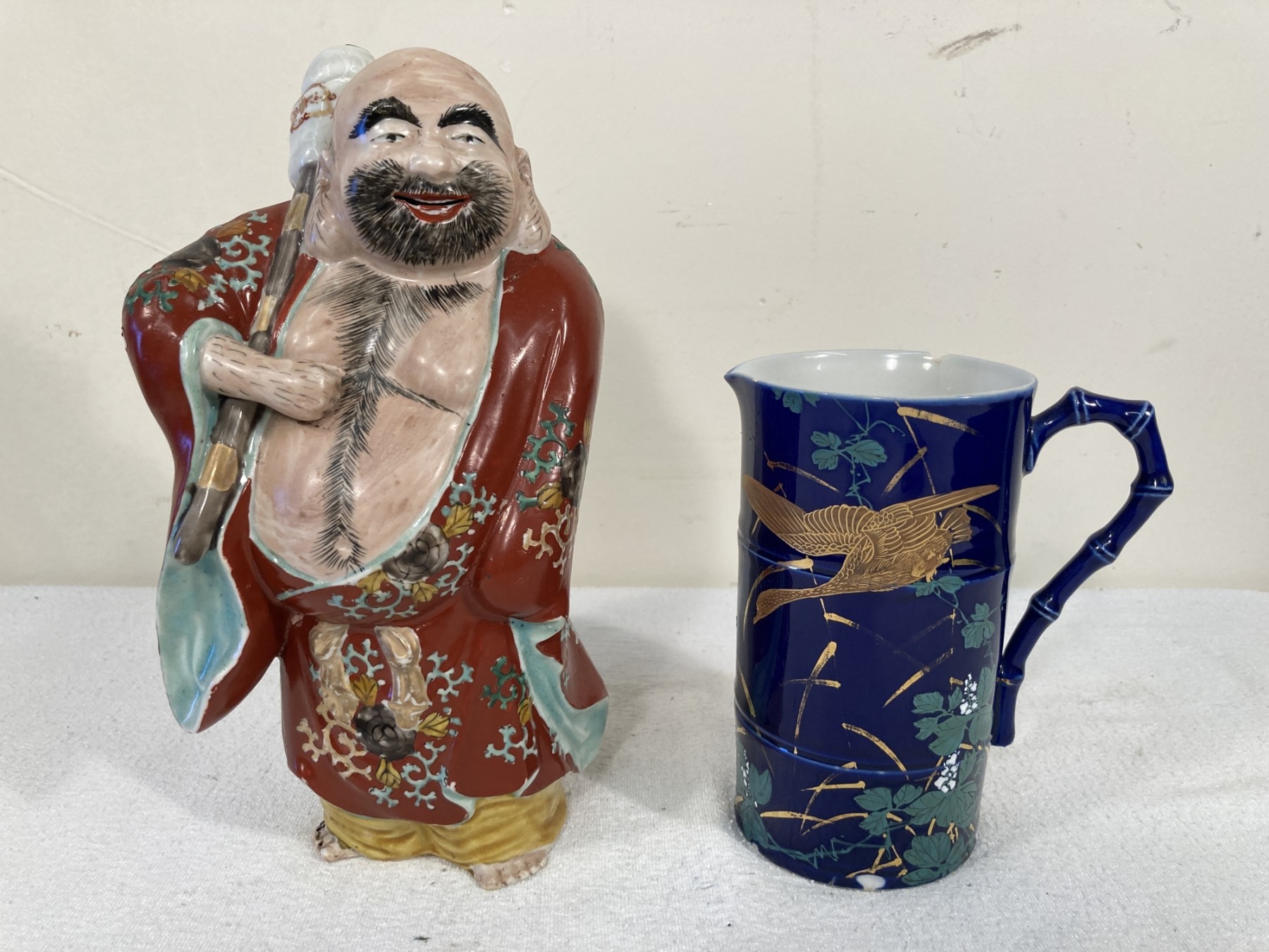 Including a Kutani porcelain laughing buddha figure and a porcelain blue gold and green decorated pitcher. Pitcher is marked and buddha is not marked.