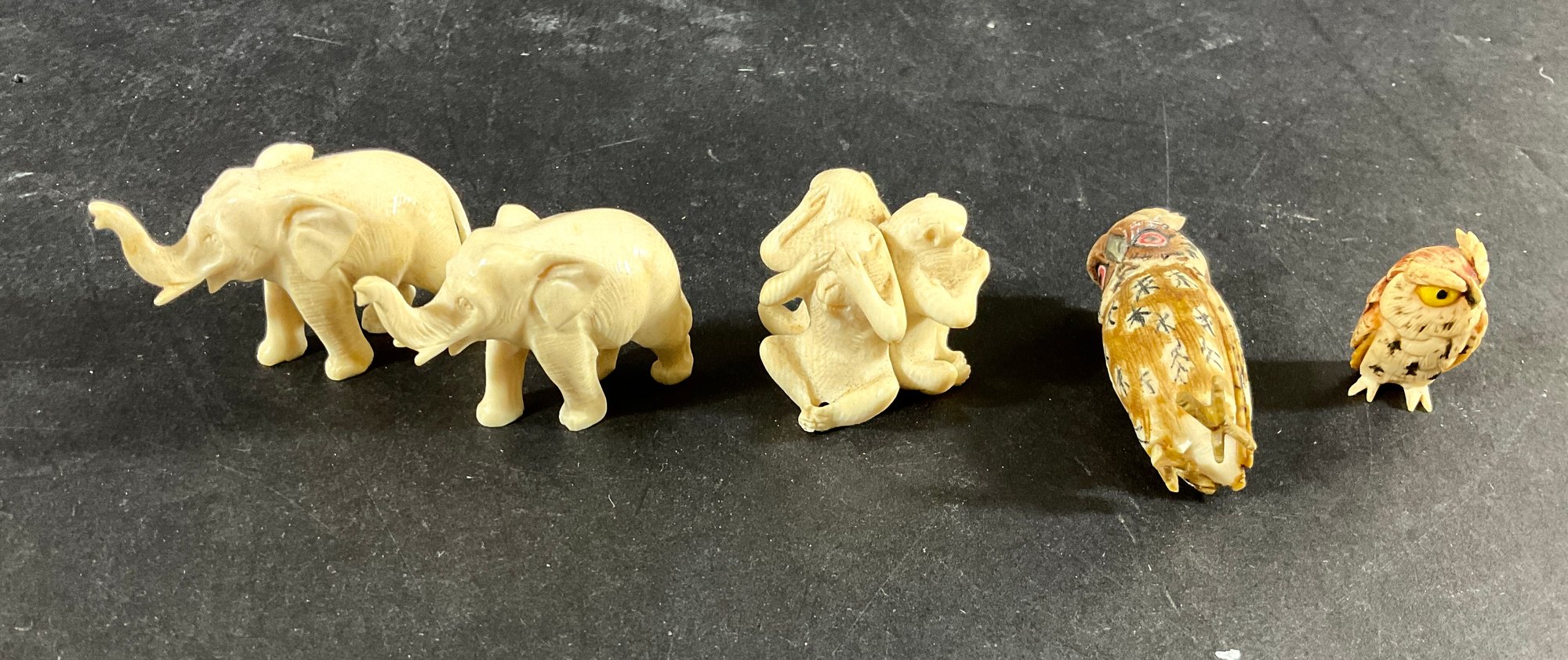 do you have a nice lot of car ivory and bone. The three monkeys see no evil here no evil and speak. No evil are signed. There are two elephants and two hours have been painted and quite nice when owl is missing a toe and will not stand. That is the only damage I can find.