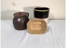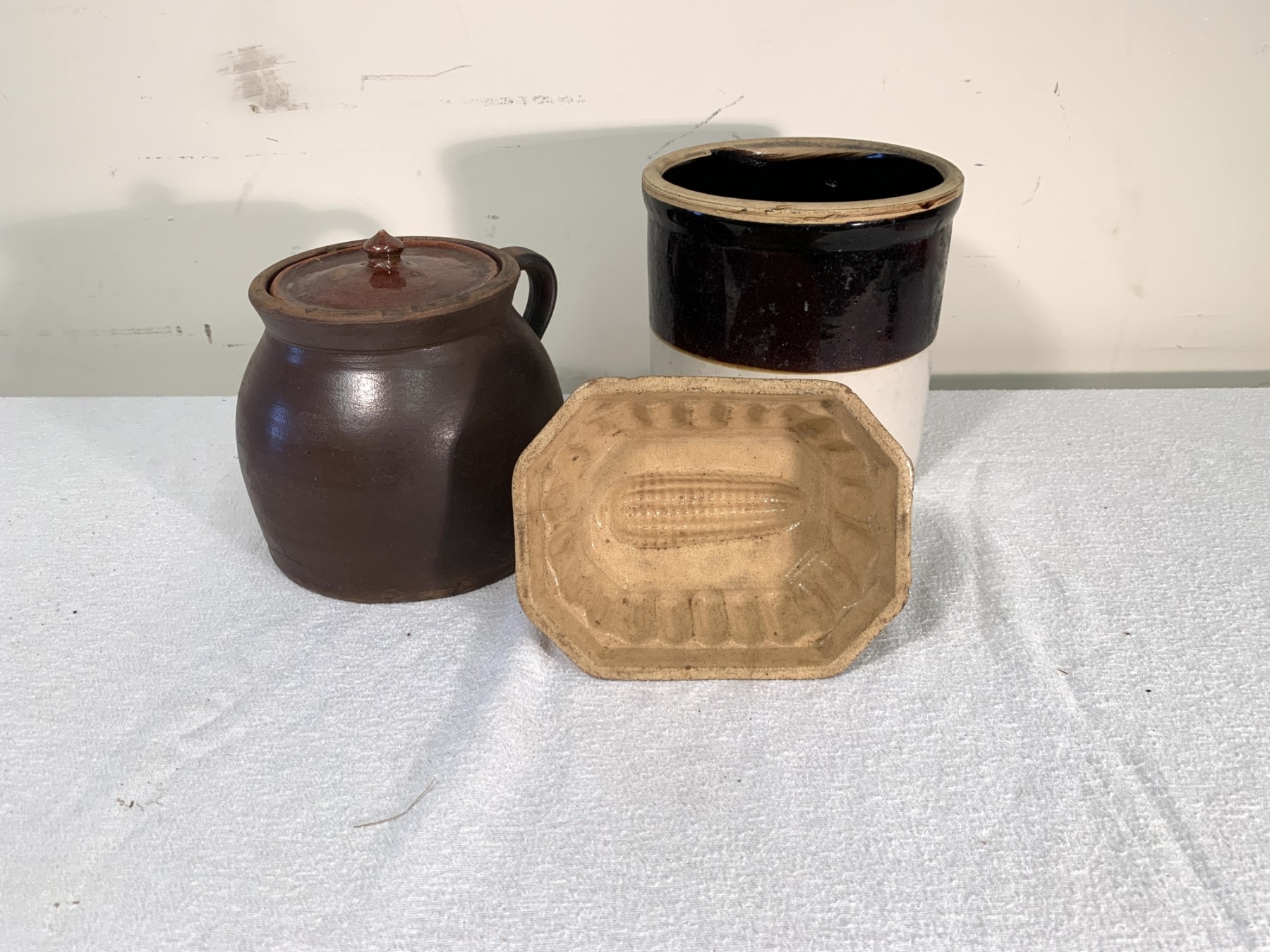 One gallon brown and white stoneware crock, Albany glazed bean pot, and a cream wear corn jelly mold. All for the 19th century.