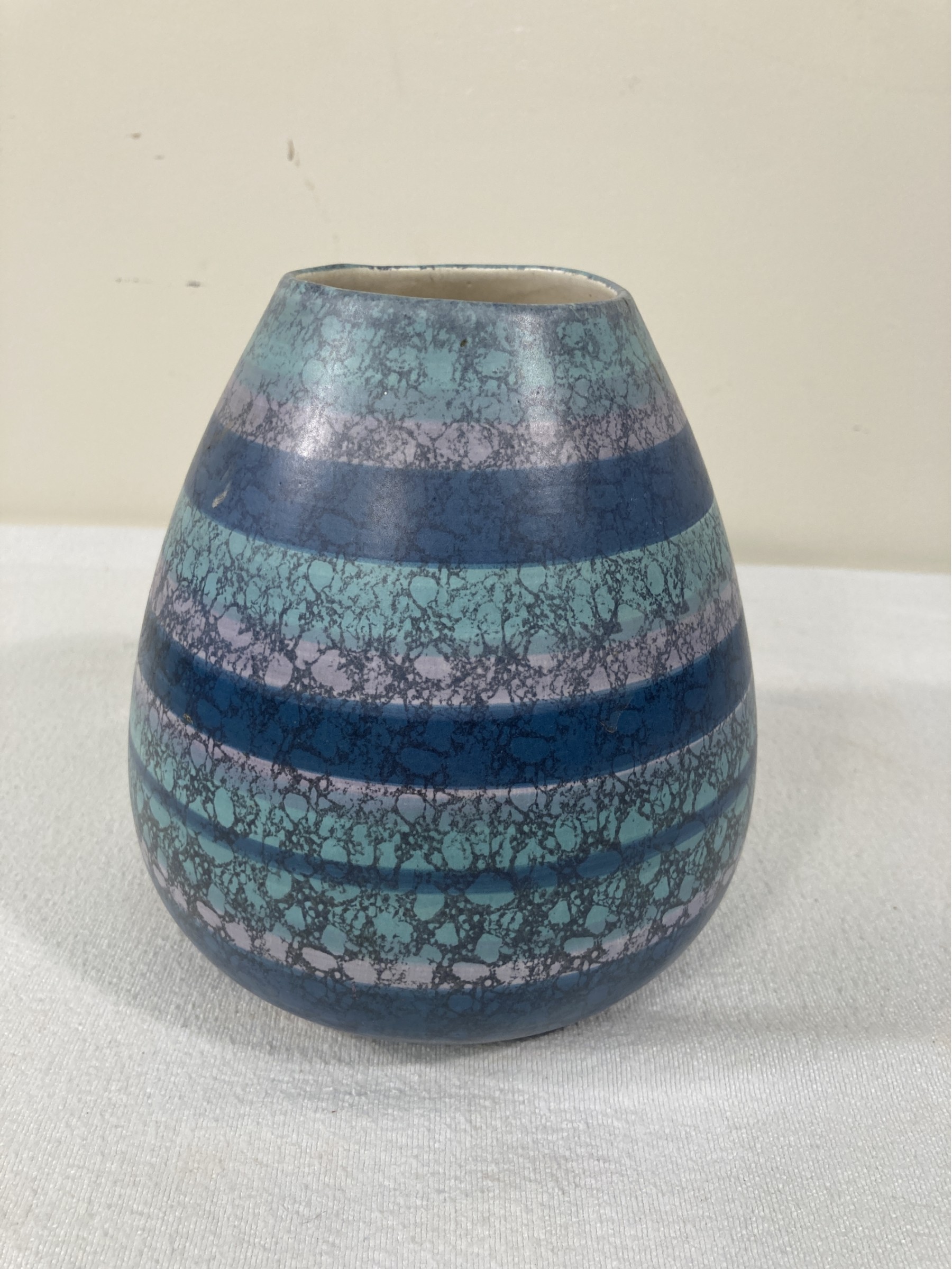 Selling a cool looking Madeline originals pottery vase with blue, green and mauve color stripes and sponge decoration as well. C. 1970s-1980s.