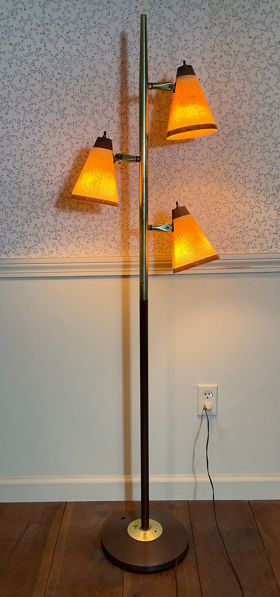 Original fiberglass shades. Brass tone lamp needs a new switch in base, it works fine now with individual switches on each light shade can be moved to all positions.