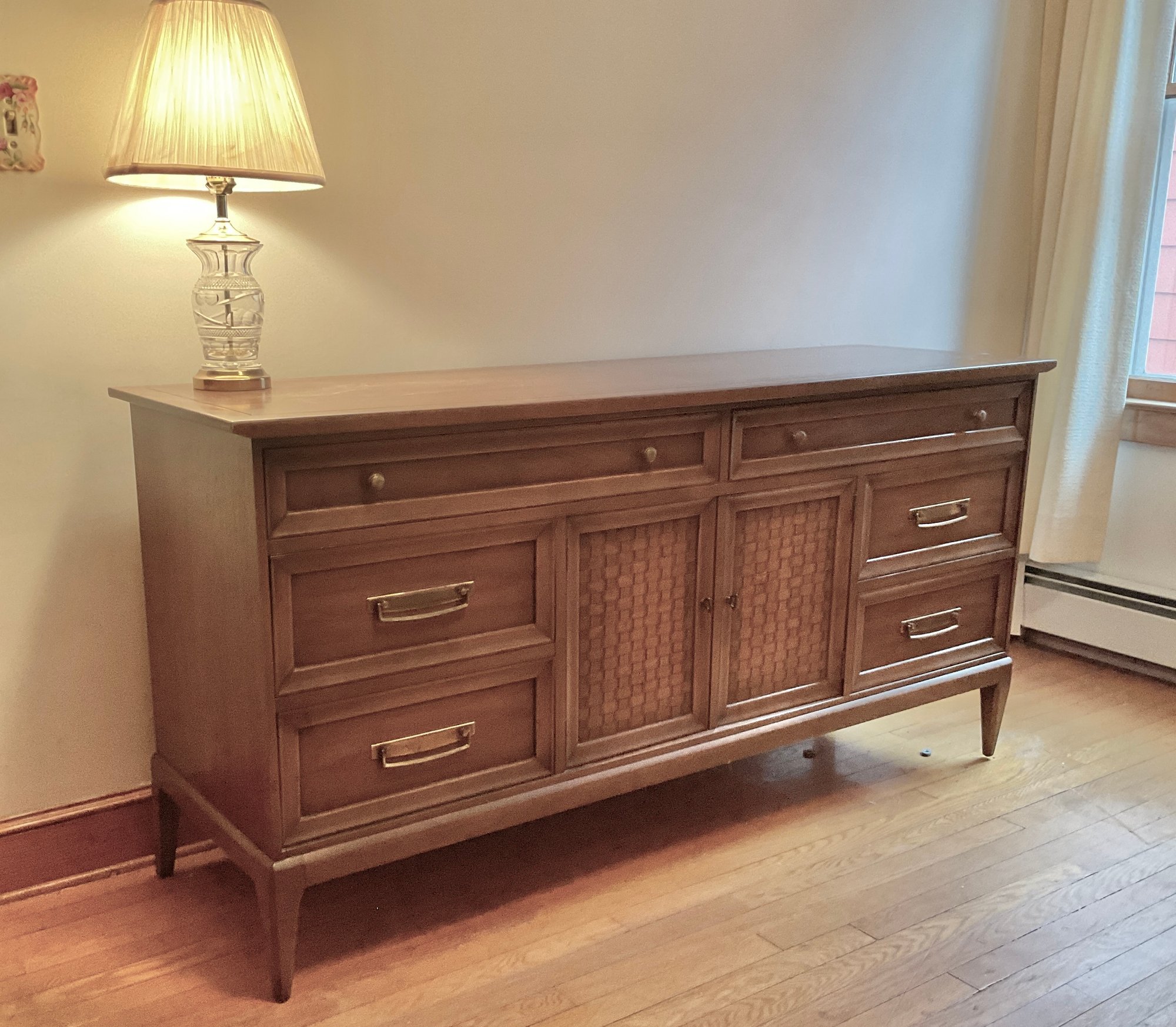 This credenza / low chest is great for either a bedroom or a console in a dining room. Nice quality walnut wood and good craftsmanship that you expect from Drexel. Stenciled on the back is manufacturer’s info and style number.