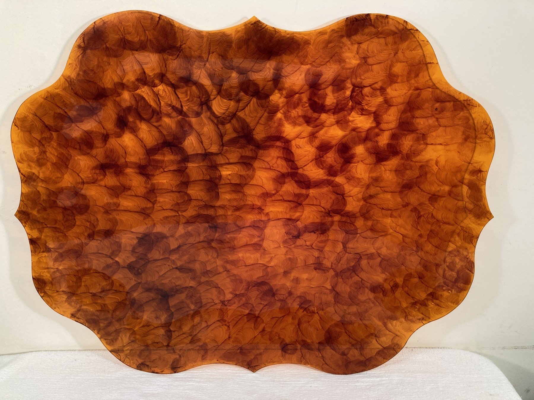 A nice mid-century acrylic serving tray with a faux tortoise shell look, a scalloped edge, very light. C 1970s