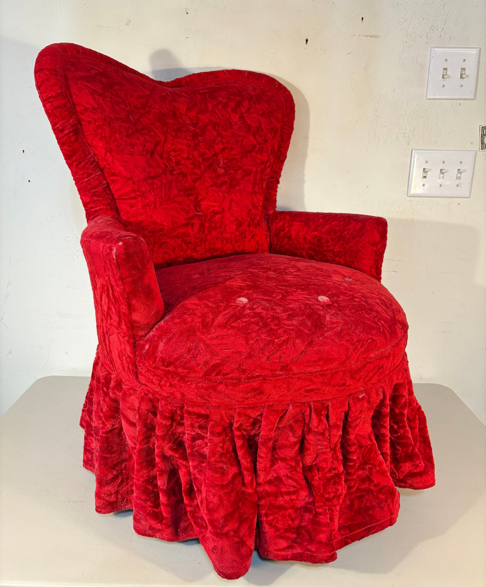 This chair is all original, including the upholstery. It is obviously made for a woman’s boudoir. The crushed acetate velvet is very lush and very red. The seat is round.Some small spots of wear see pictures. for complete detailed description.