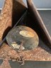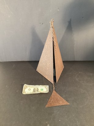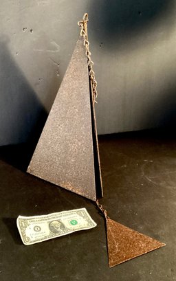 * this has a triangular shape of three pieces of weathered metal with the coinciding bell within and has a chain to hang on your favorite tree. This measures approximately 15” in height and from side to side measures approximately 8” plus chain