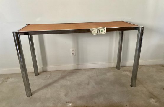 Milo Baughman inspired chrome and wood mid century console table This style was made popular in the mid 1960’s Chrome is in good vintage condition. Table top is without stains or damage.