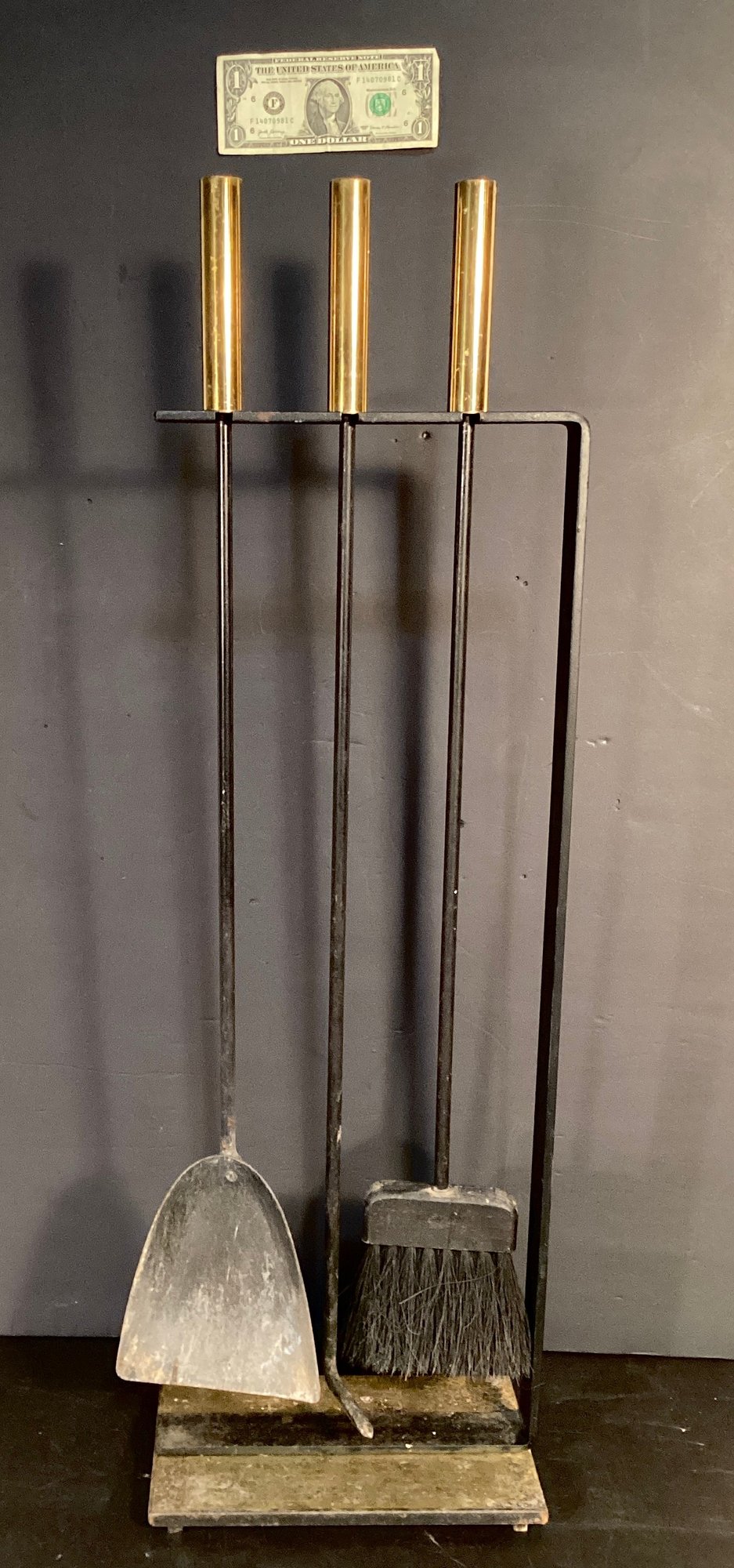 * this is a set that features a minimalist freestanding cast-iron stand. The design is attributed to George Nelson..* this includes tools poker, shovel & broom