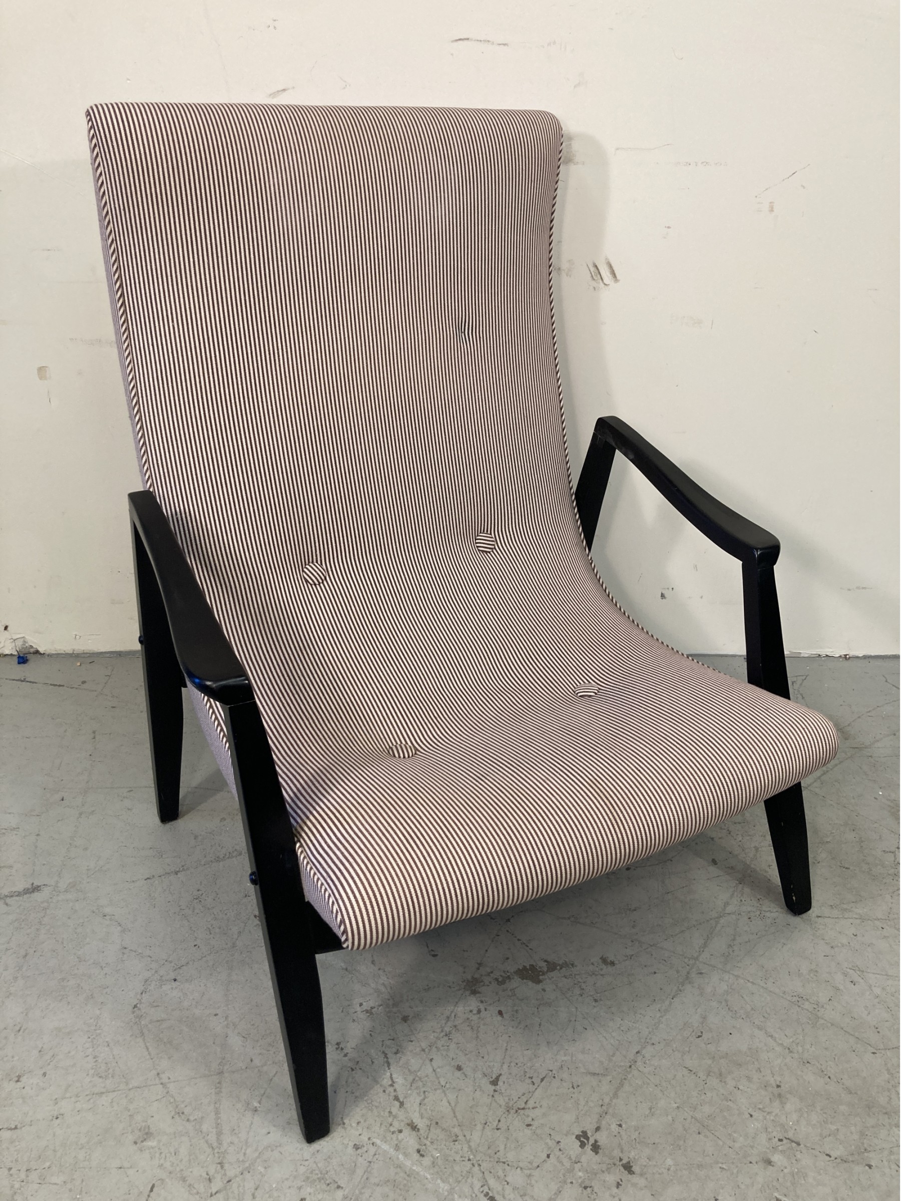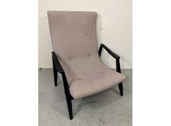 Selling a mid-century modern scoop back upholstered lounge chair. A striped fabric in off-white and lavender colors. Painted black frame.