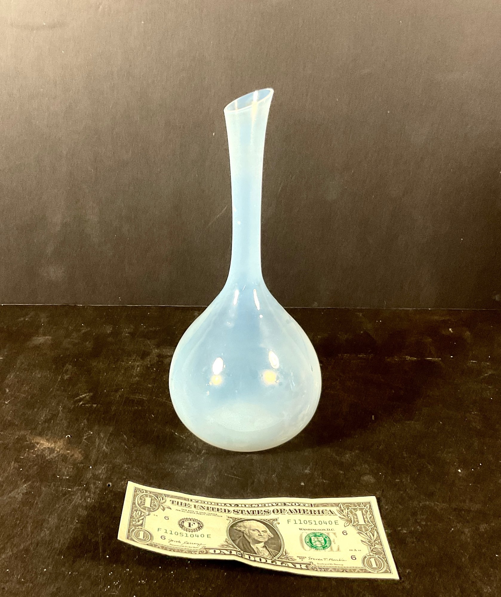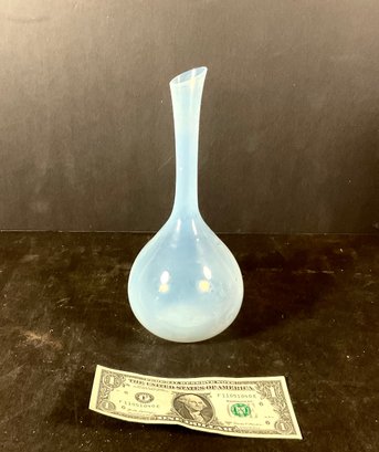 This vase is very delicate handblown. Georg Jensen inspired. Or possibly Donghia. It’s got fabulous color, and great quality as you can see in the photograph measurements. 9.5” tall