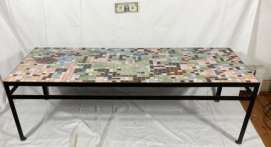 Unique Mid Century Mosaic tile coffee table with heavy wrought iron base. Very cool .artist made. Circa 1950-1960