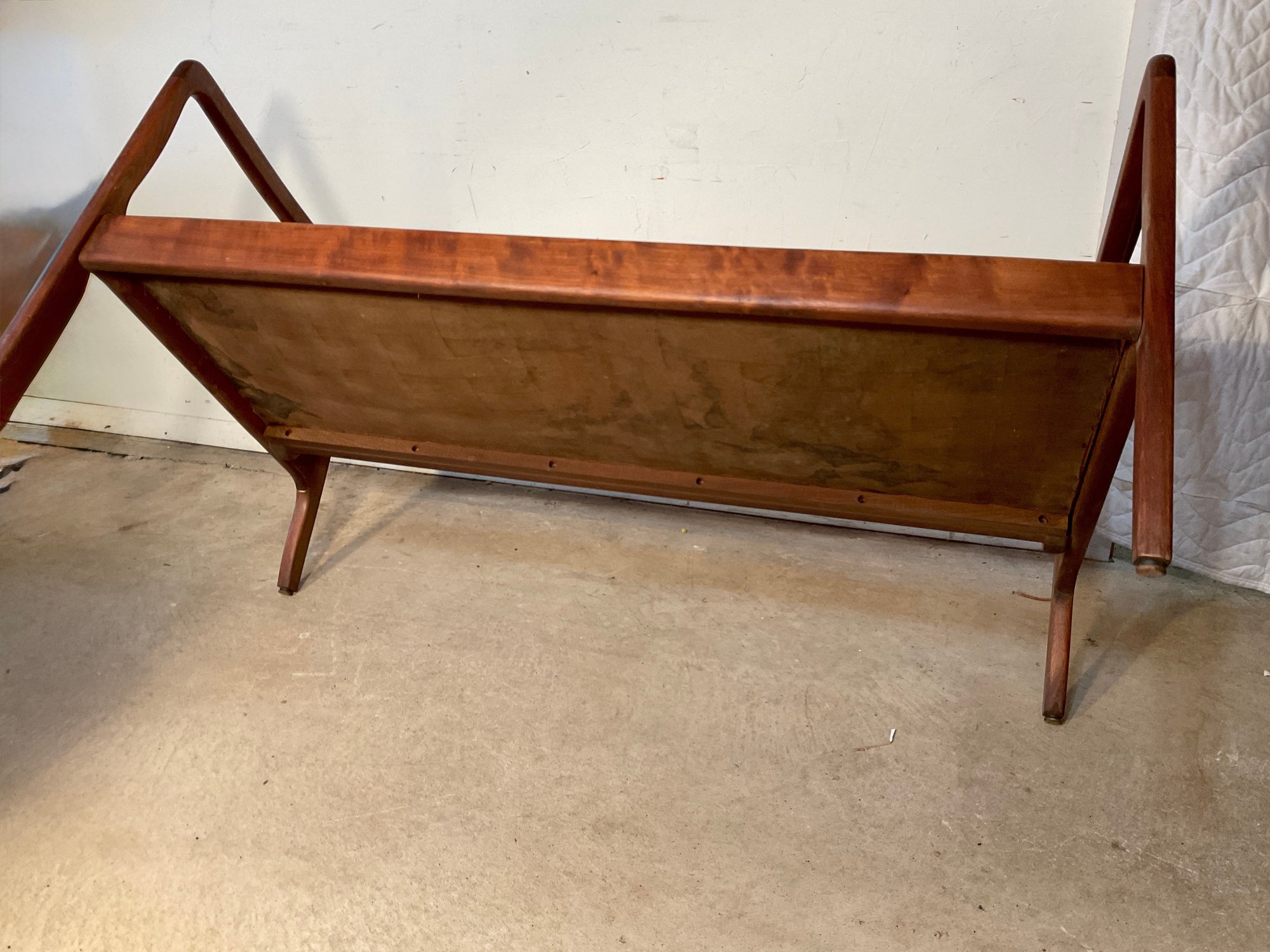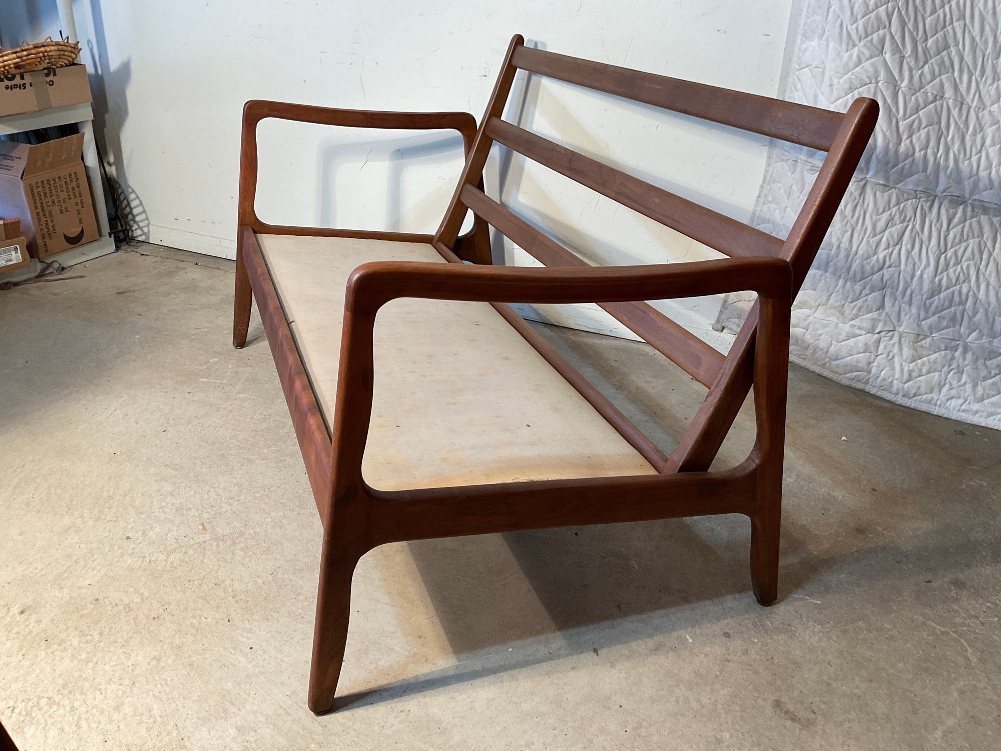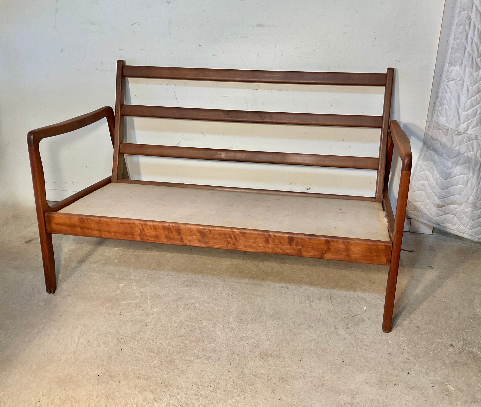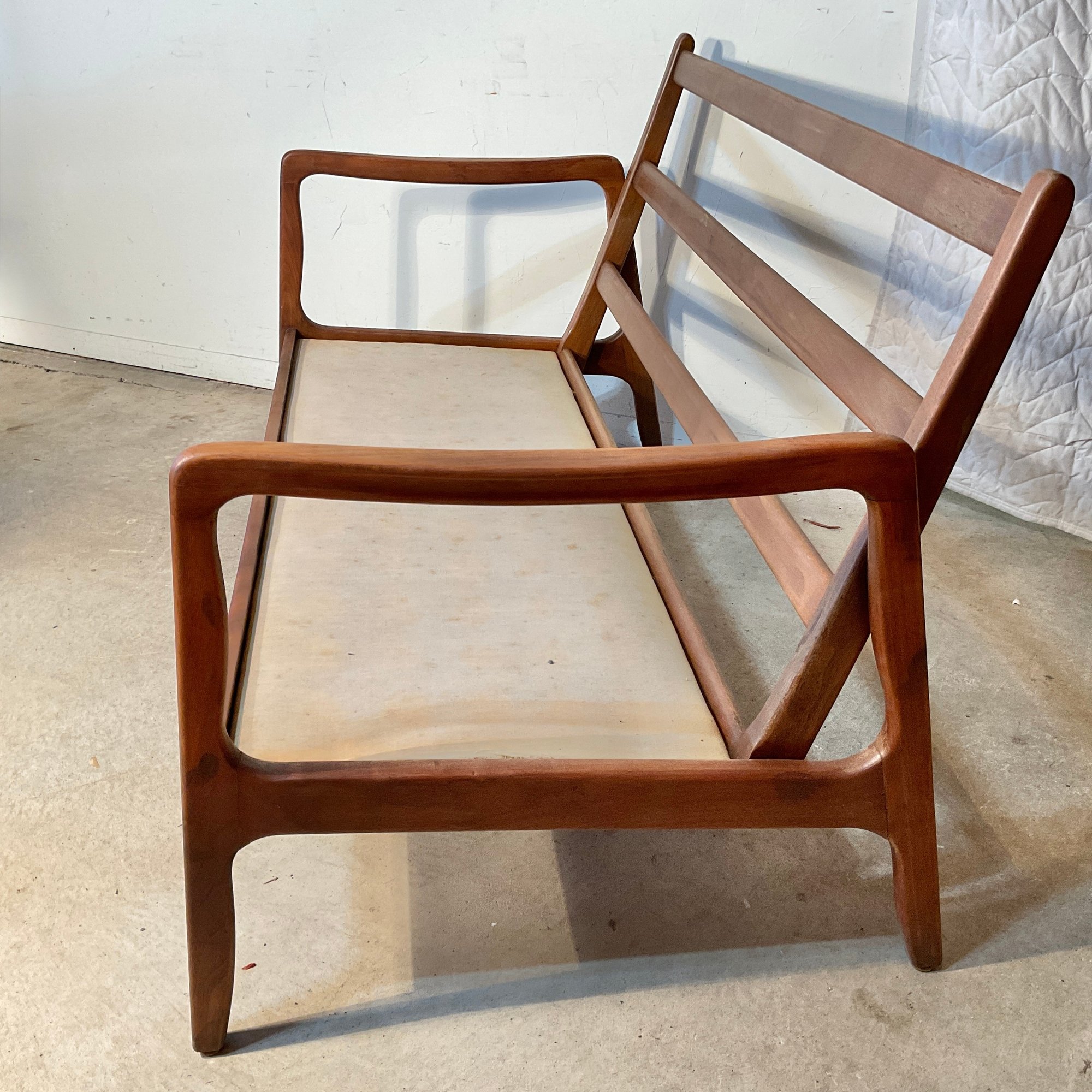 This solid teak settee dates from the mid century probably 1960. It is labeled.