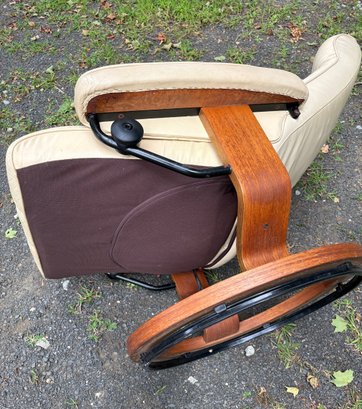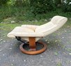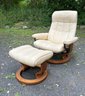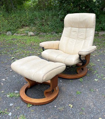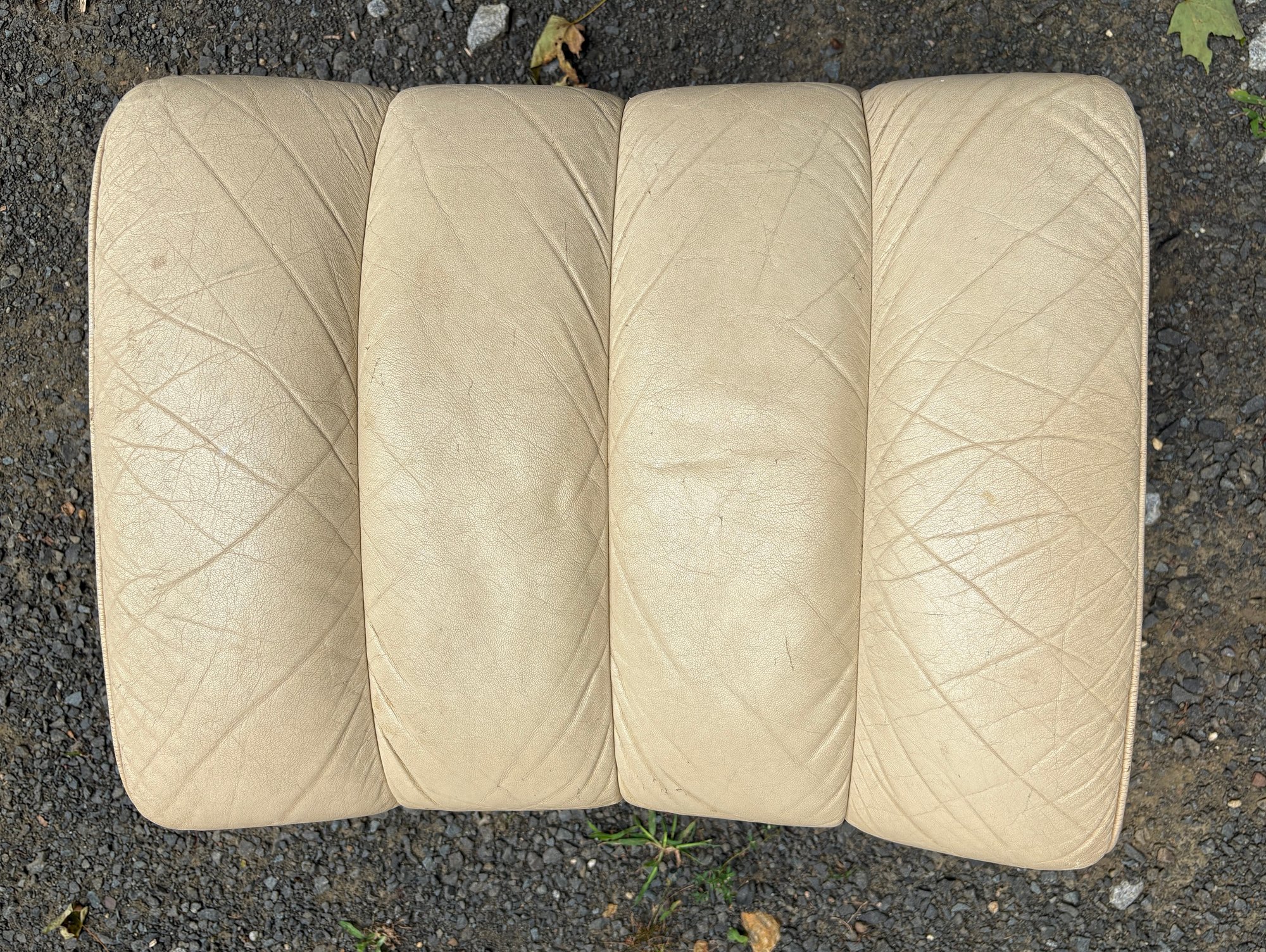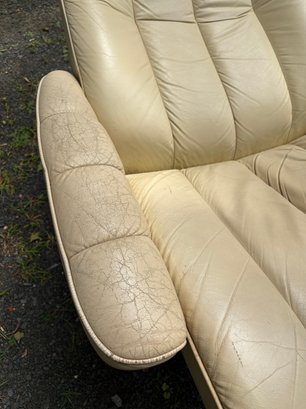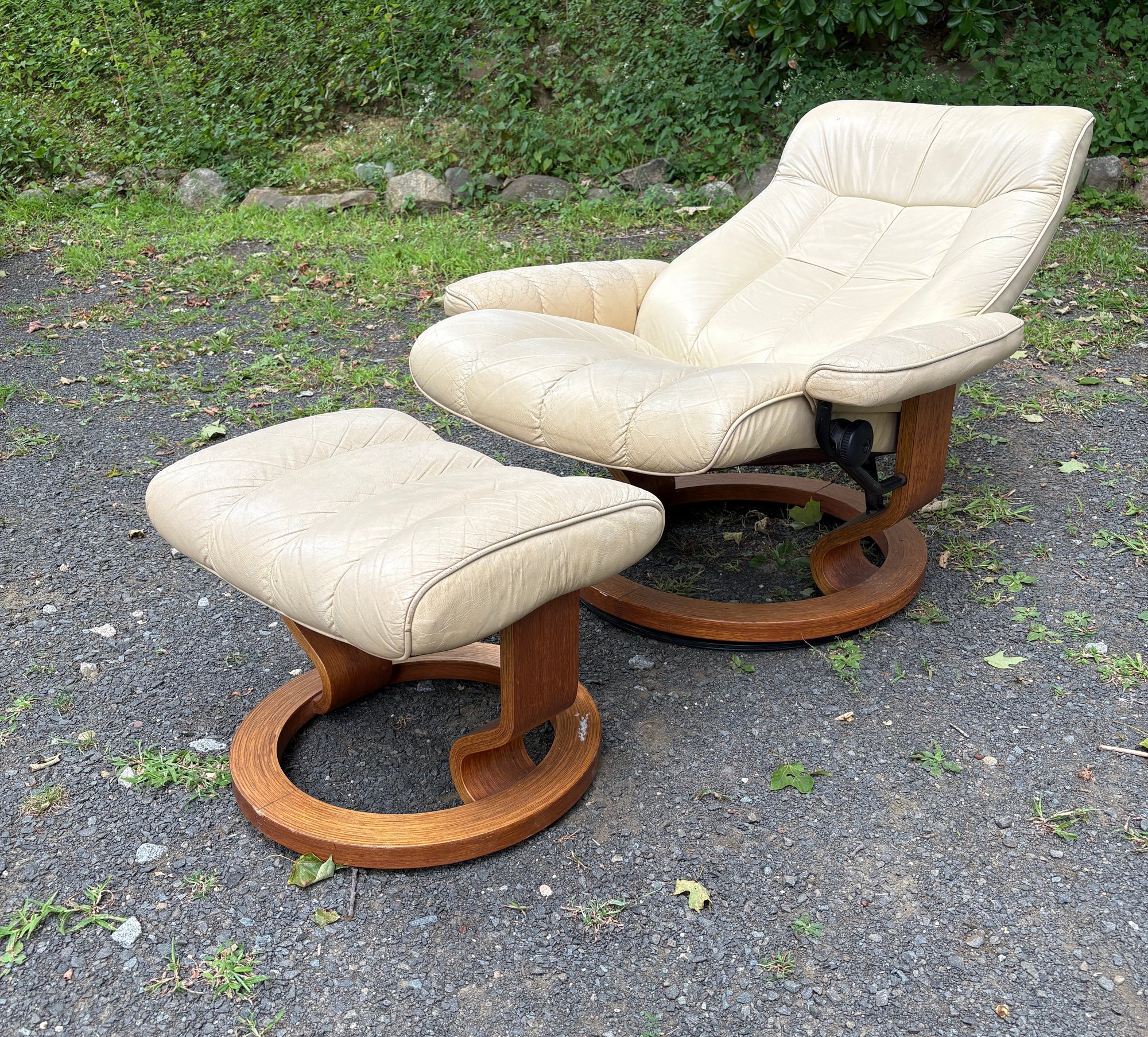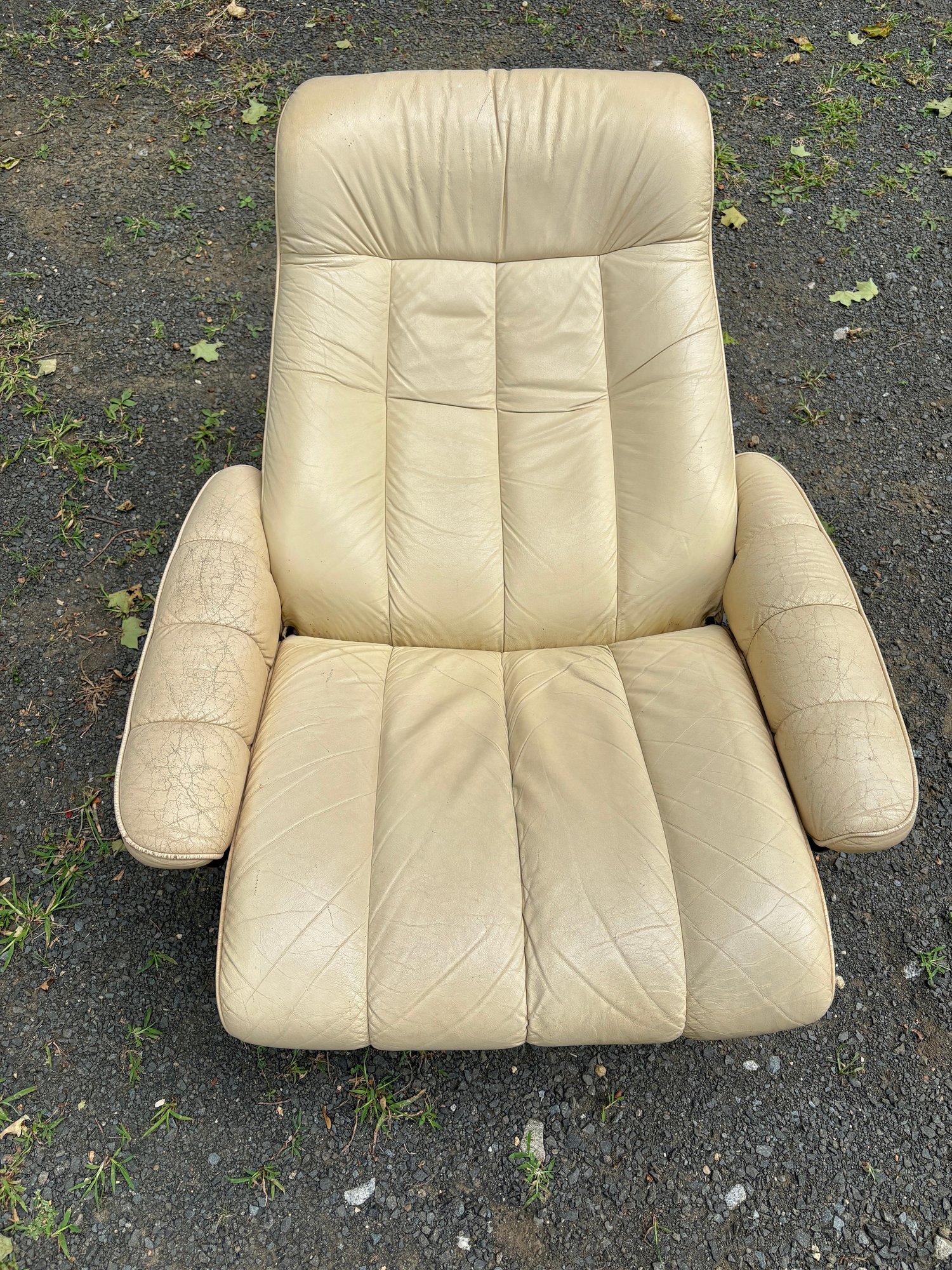 Very comfortable, leather upholstery has a nice used look with no unsightly problems, age appropriate wear, chair reclines very nicely, ottoman is in good condition as well. Nice cream color leather.