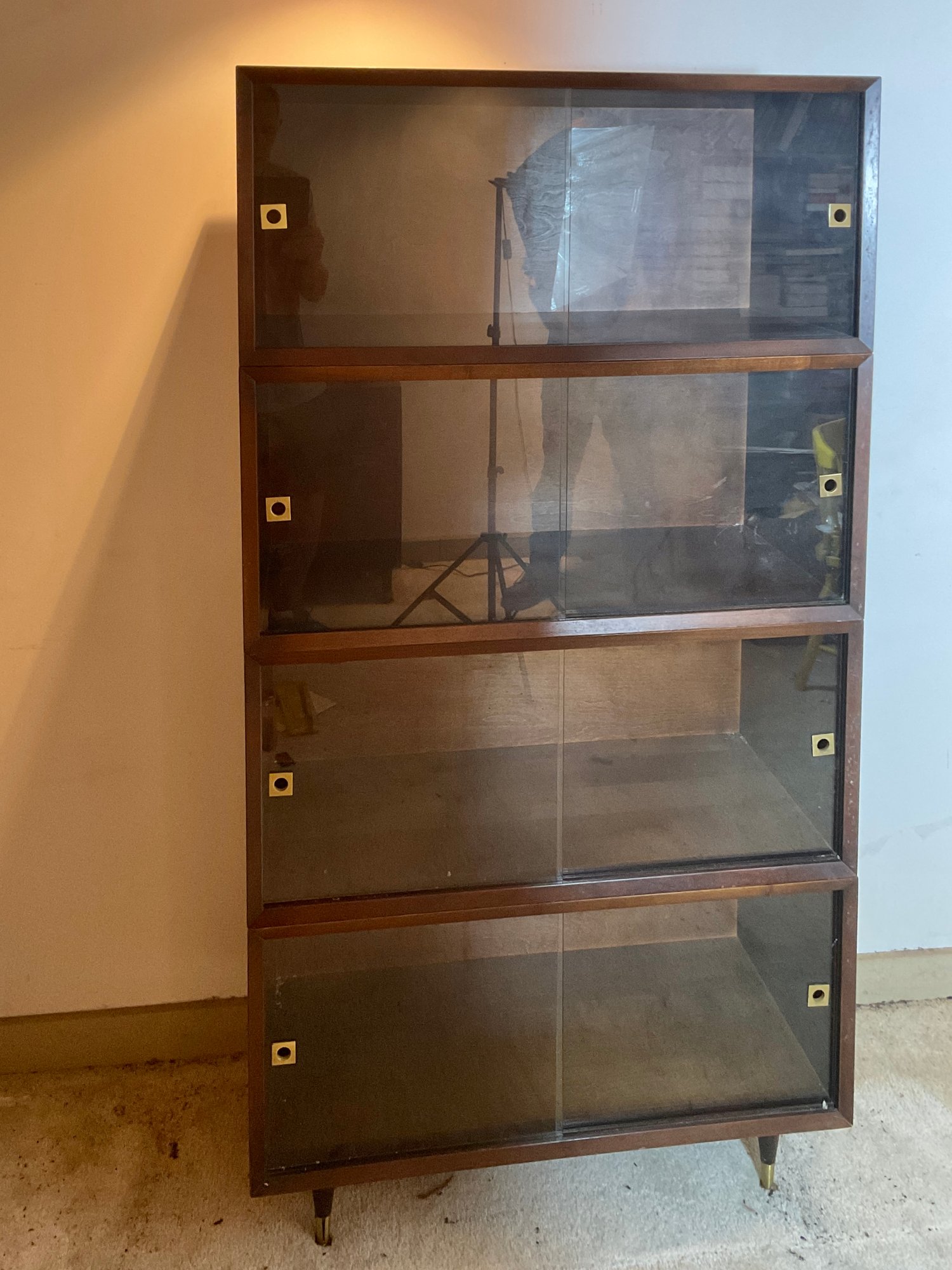The pictures on this piece do not do it justice. The sliding glass doors have brass finger holes. The wood is exceptionally nice and sturdy and the glass doors are plate glass quarter inch thick. Everything works well a little dusty ready to use..