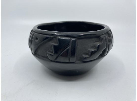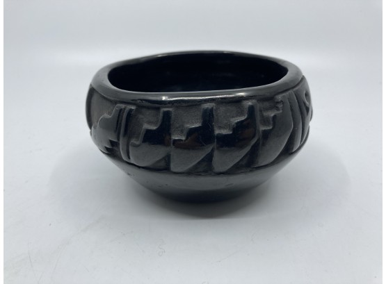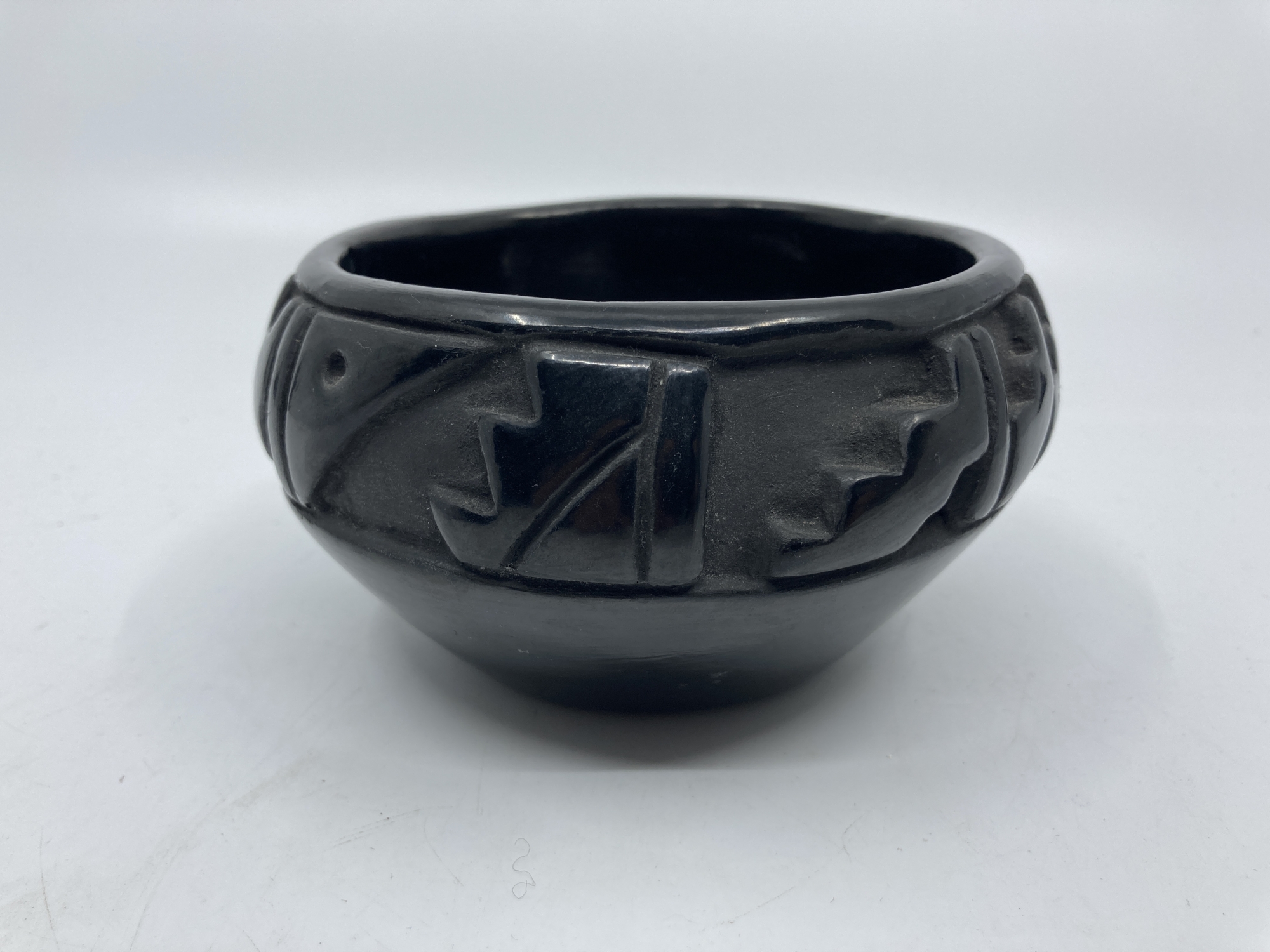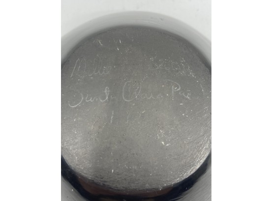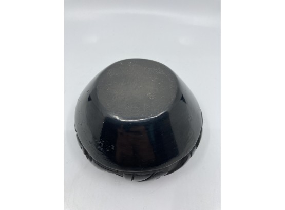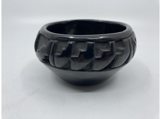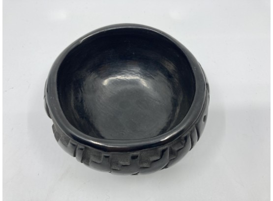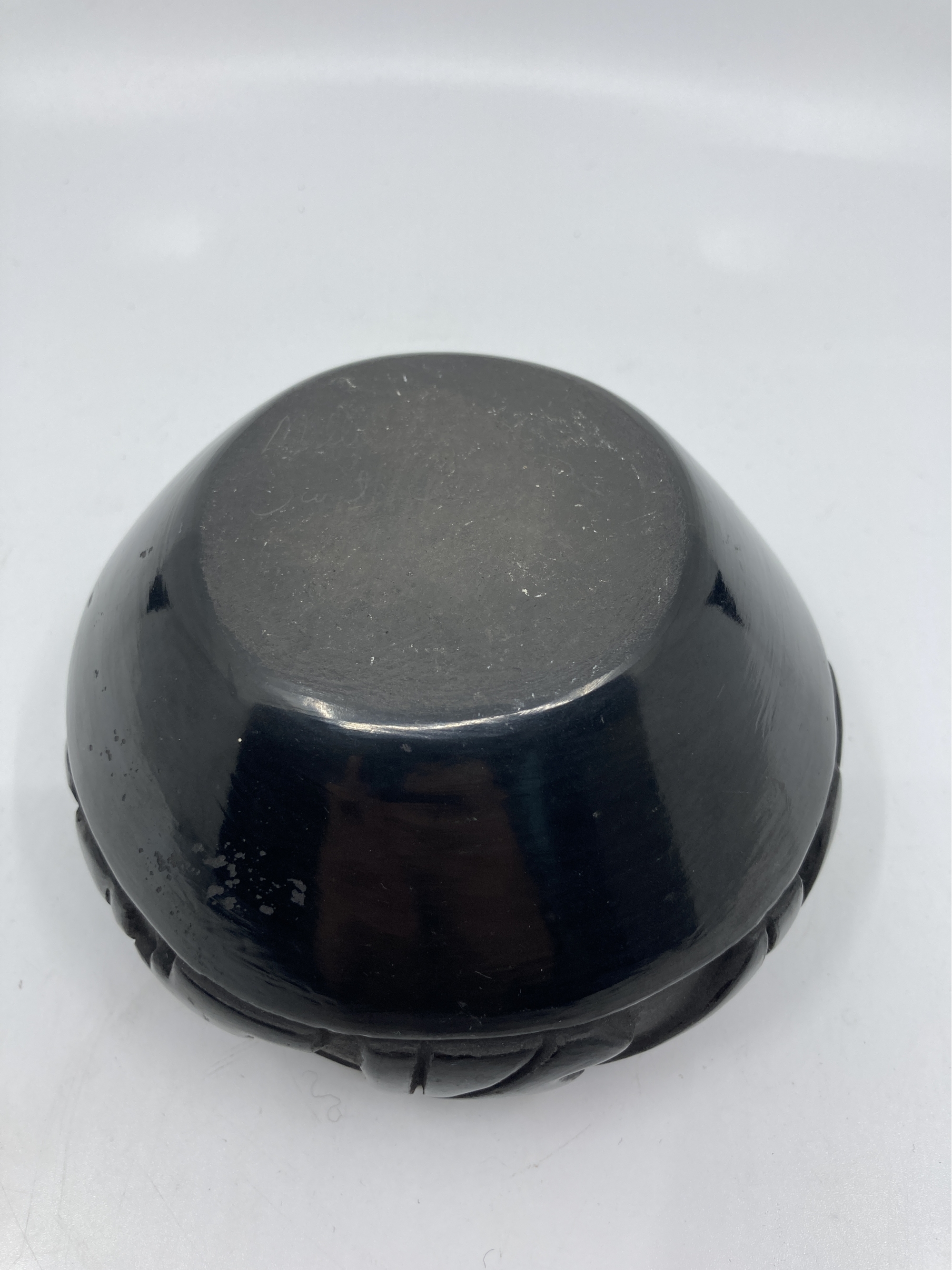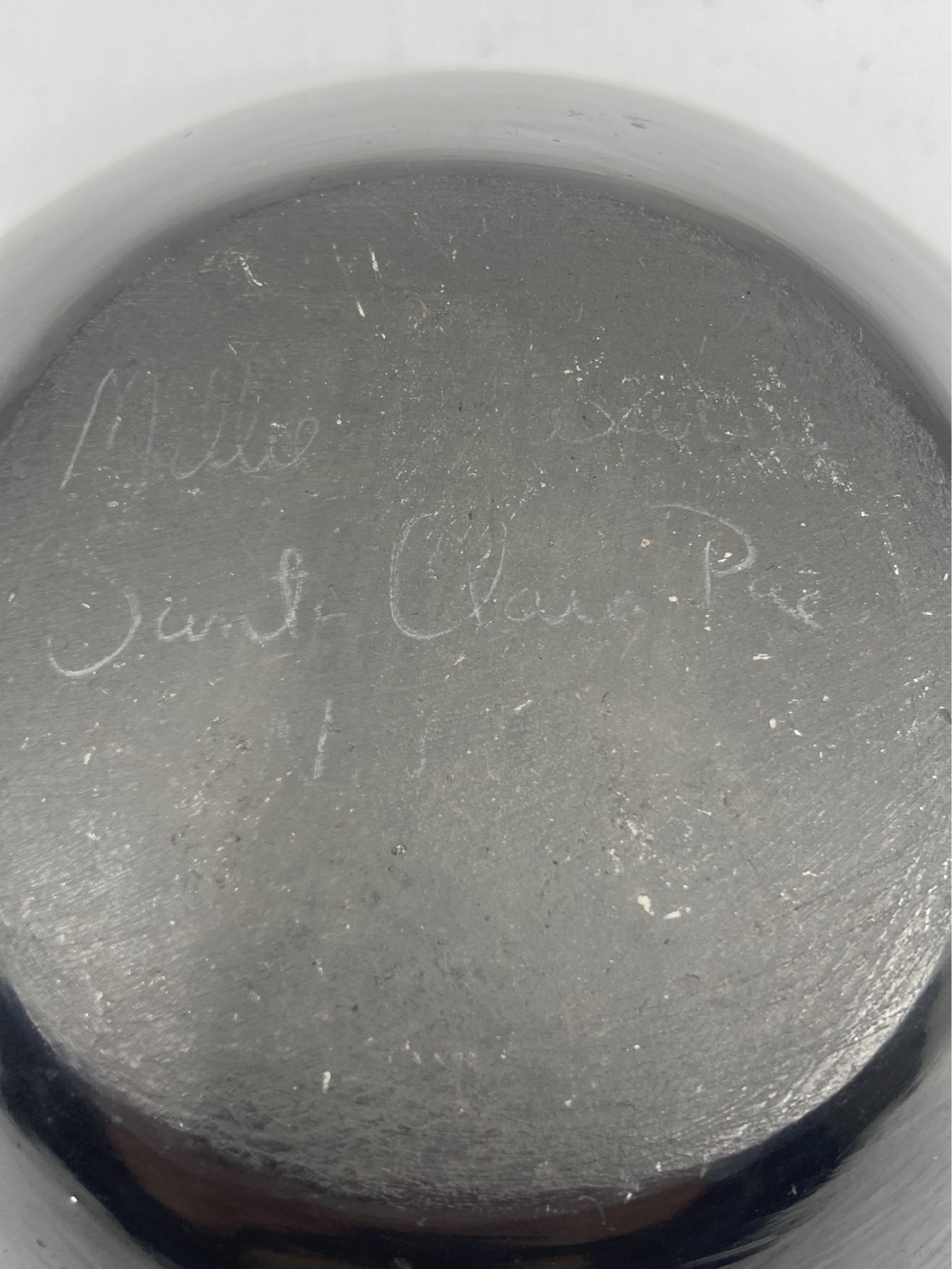 Selling an original Millie Chavarria Santa Clara Pueblo, N.M. Black pottery bowl with decoration around the top rim. Signed on the base.
