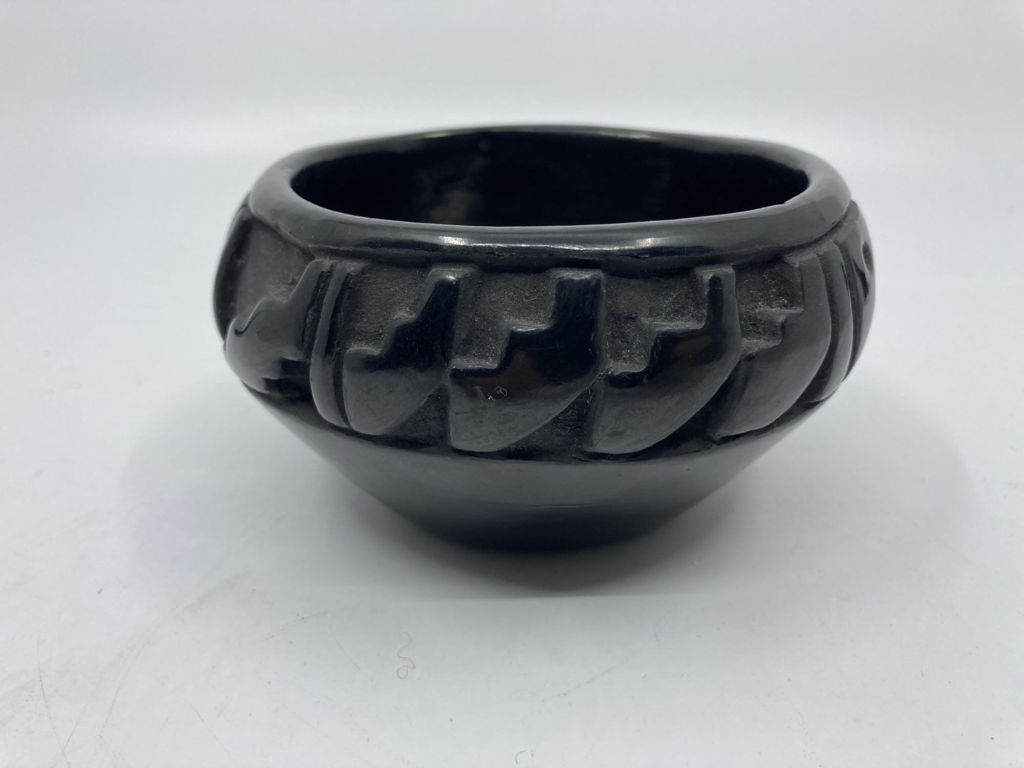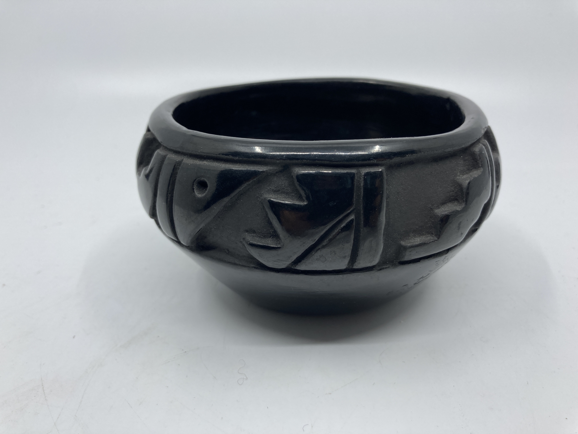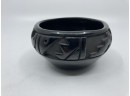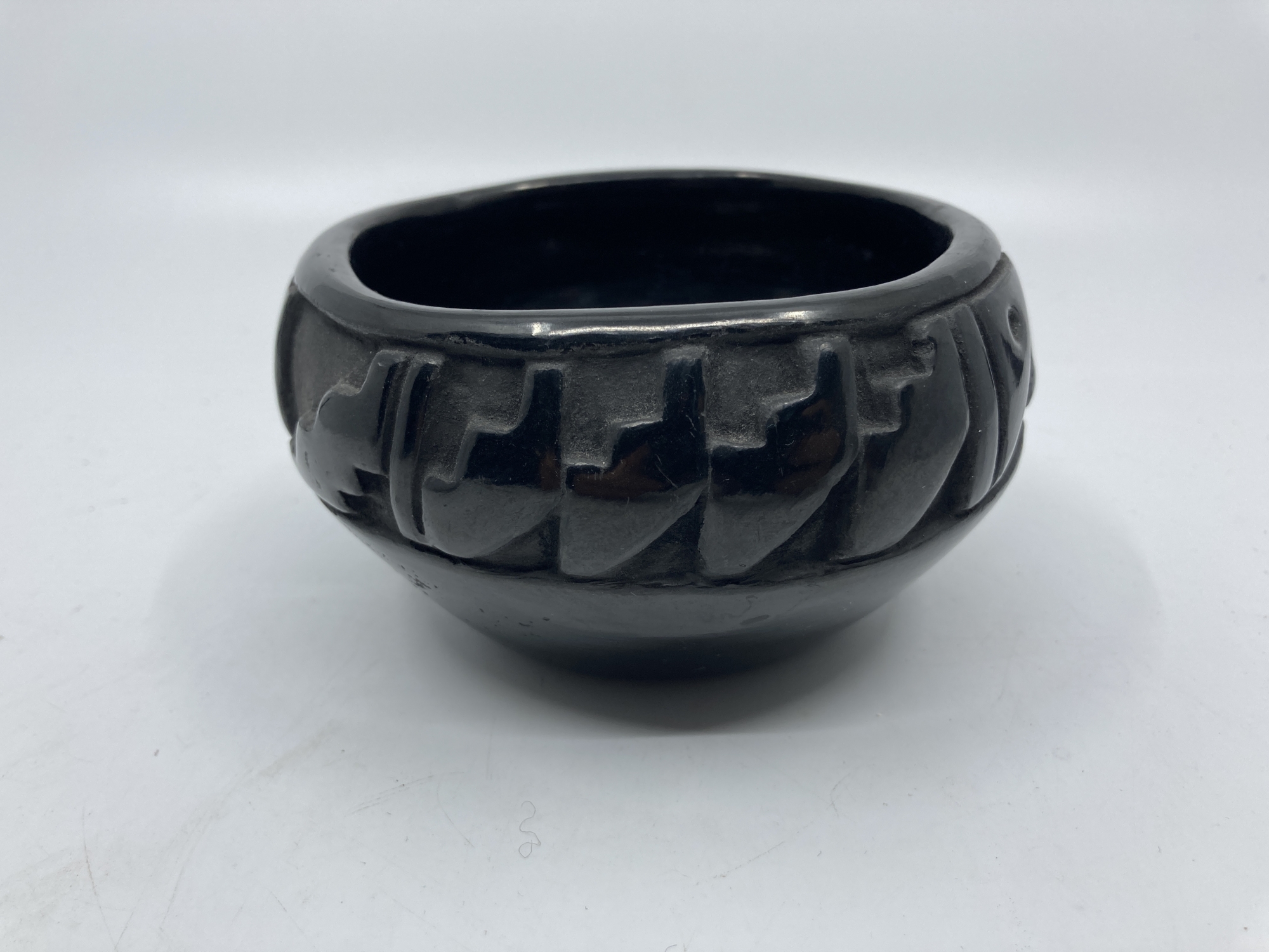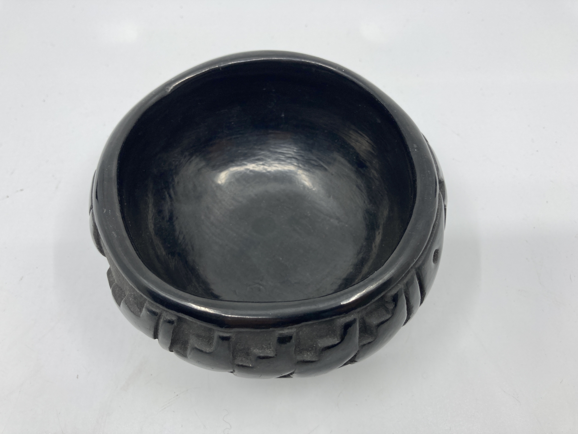 Selling an original Millie Chavarria Santa Clara Pueblo, N.M. Black pottery bowl with decoration around the top rim. Signed on the base.