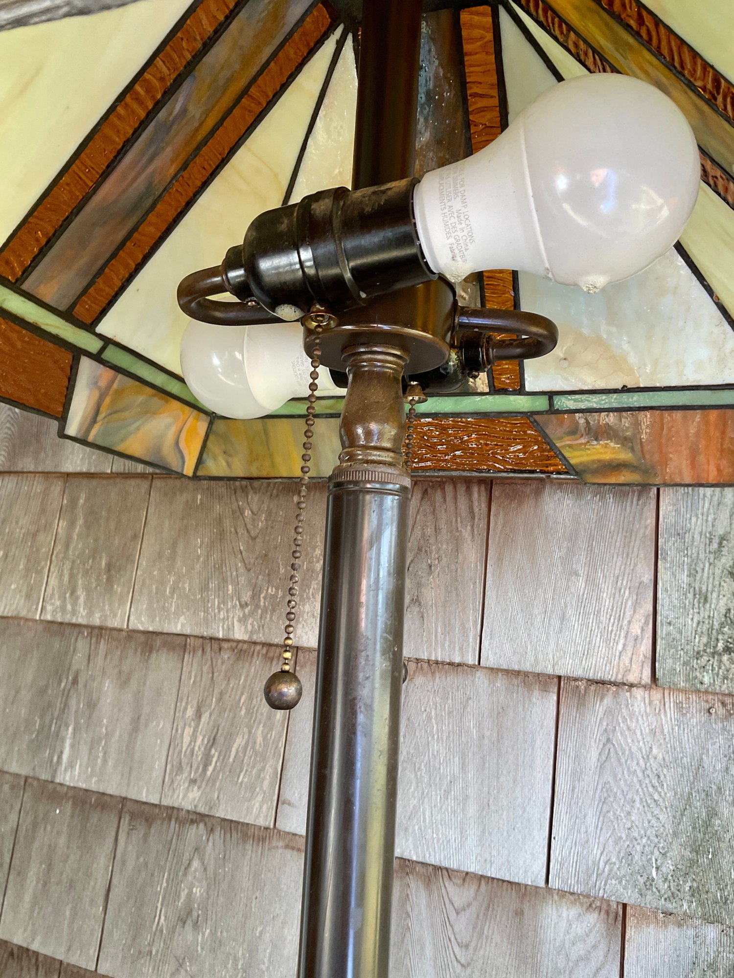 This lamp is very heavy and well-made. The shade has very nice coloring with no brakes or cracks. The base looks like heavy patina bronze color not sure the metal. A great look for the right place in your home.