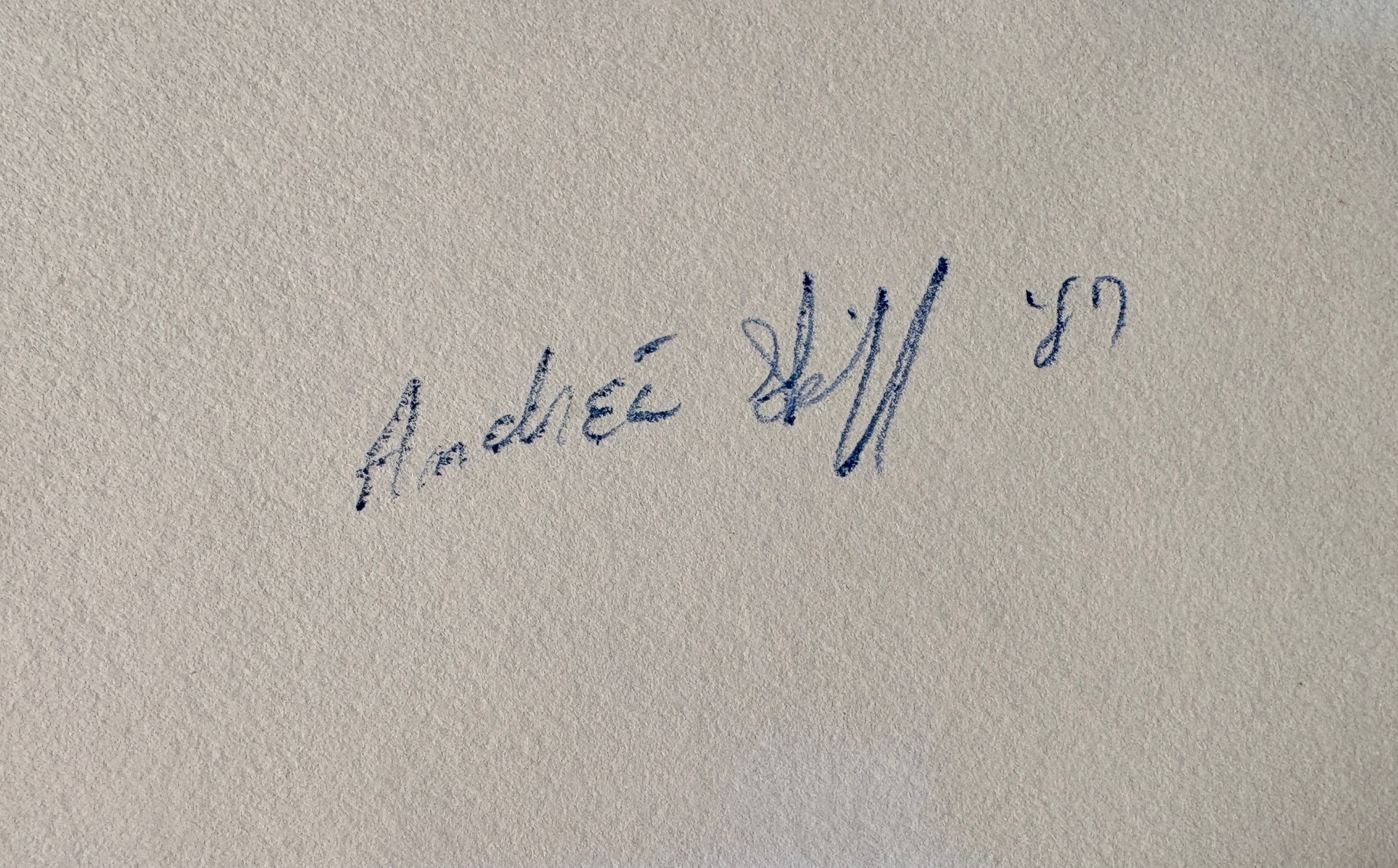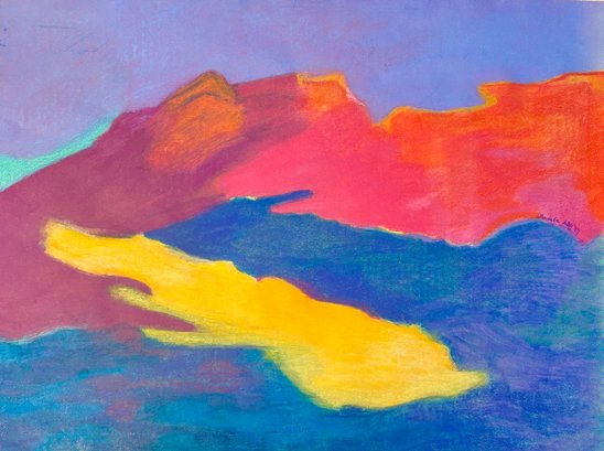 Very colorful abstract of mountains. Dated 1987. Unframed heavy artist paper,