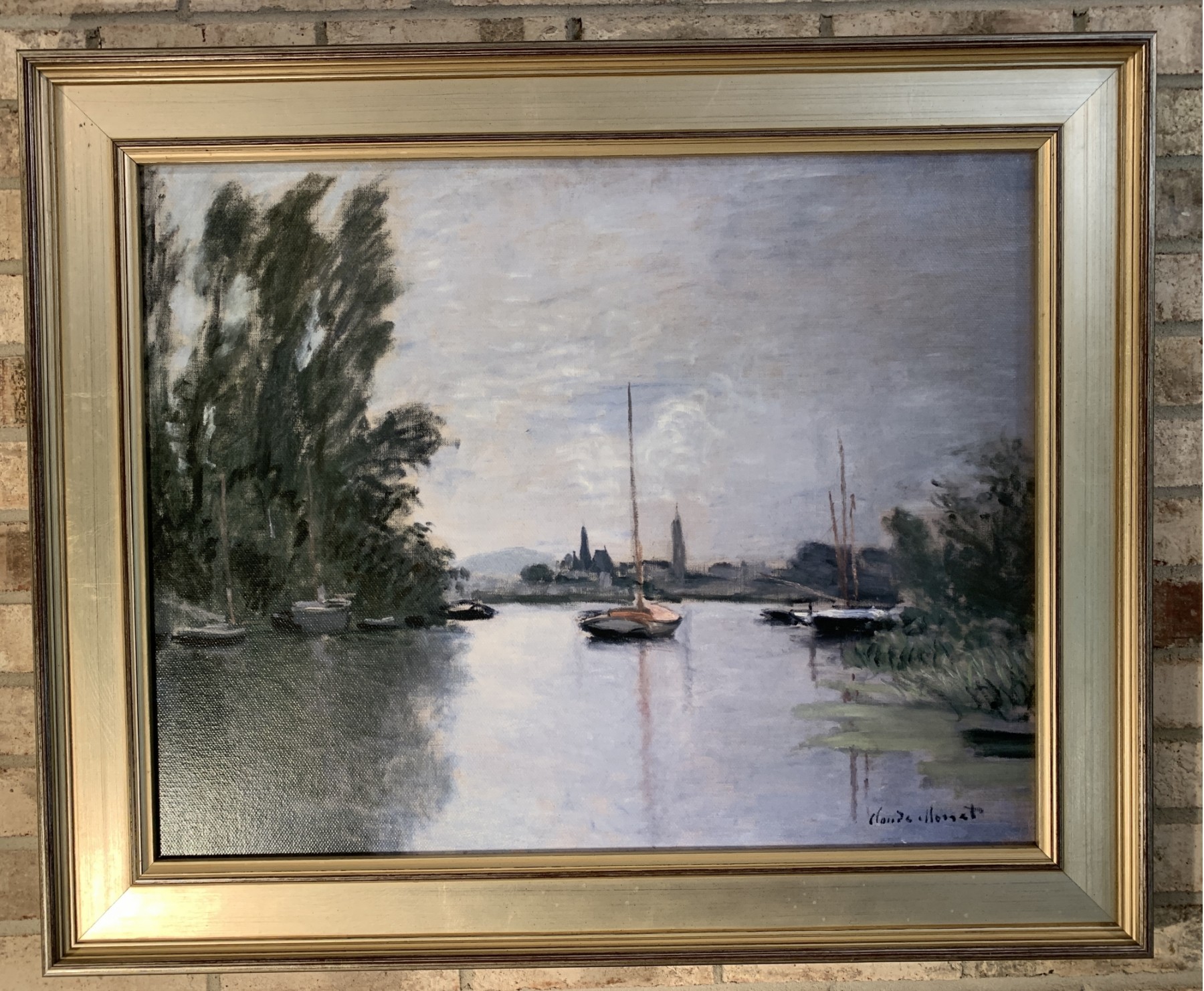 A modern giclee print of Claude Monet le Vergne sailboats on canvas, in a good quality silver gilt wooden frame. Excelent Quality
