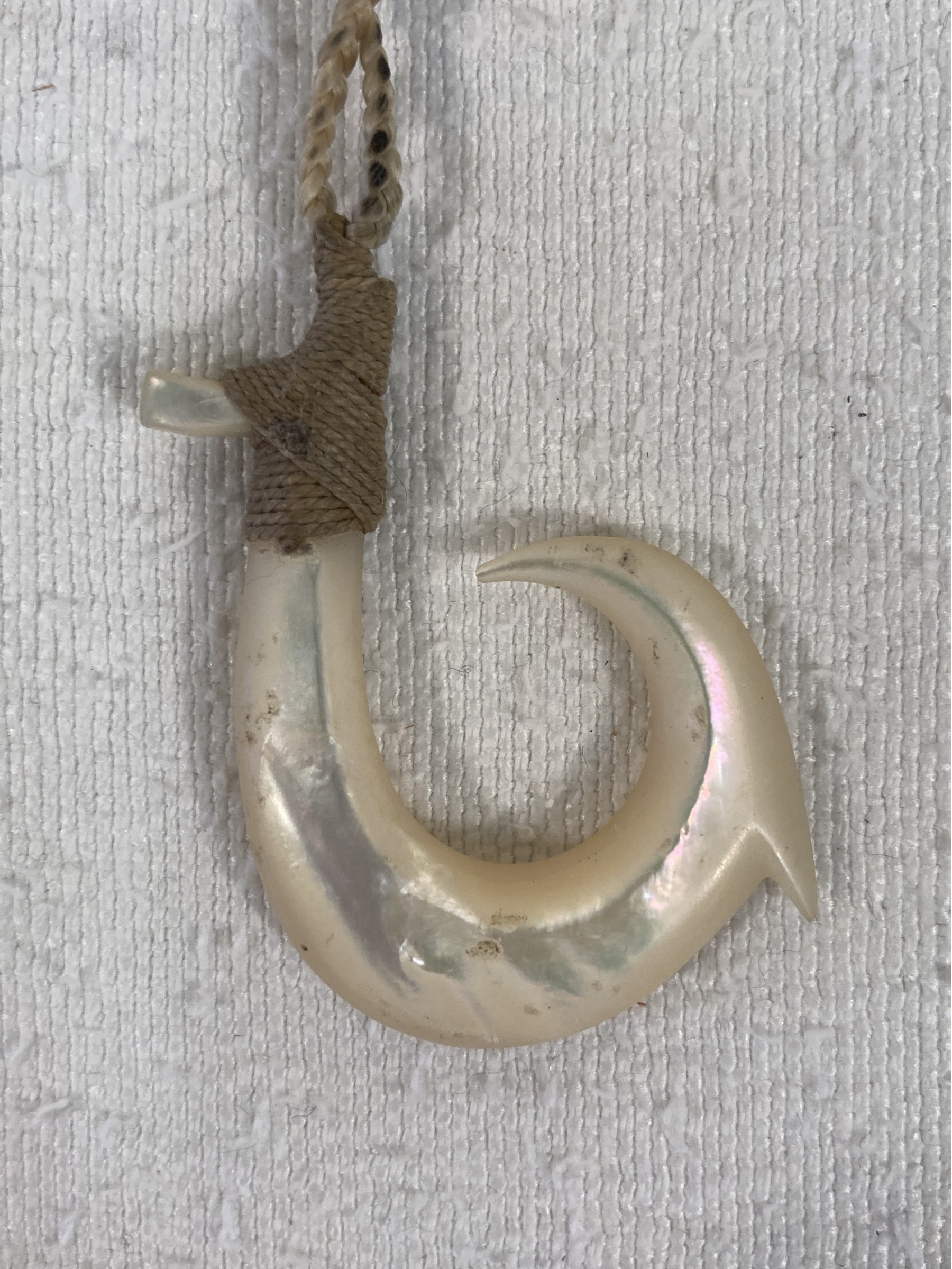 Selling a mother of pearl hand carved fish hook pendant necklace. Made in Hawaii.