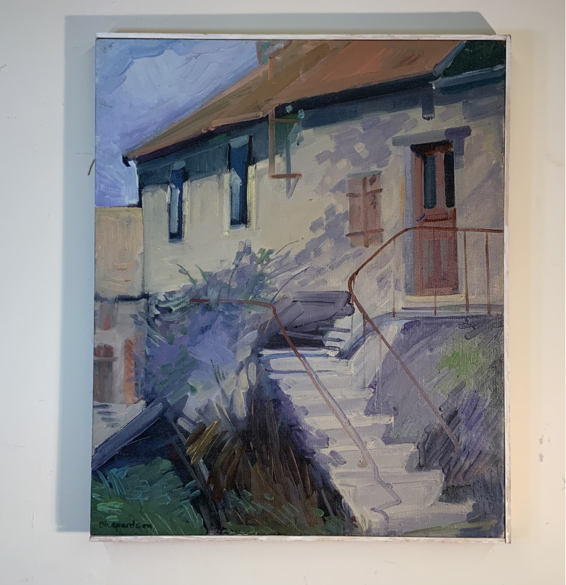 Oil on canvas done by local artist Shepardson 1960-1970. Small this wood frame.