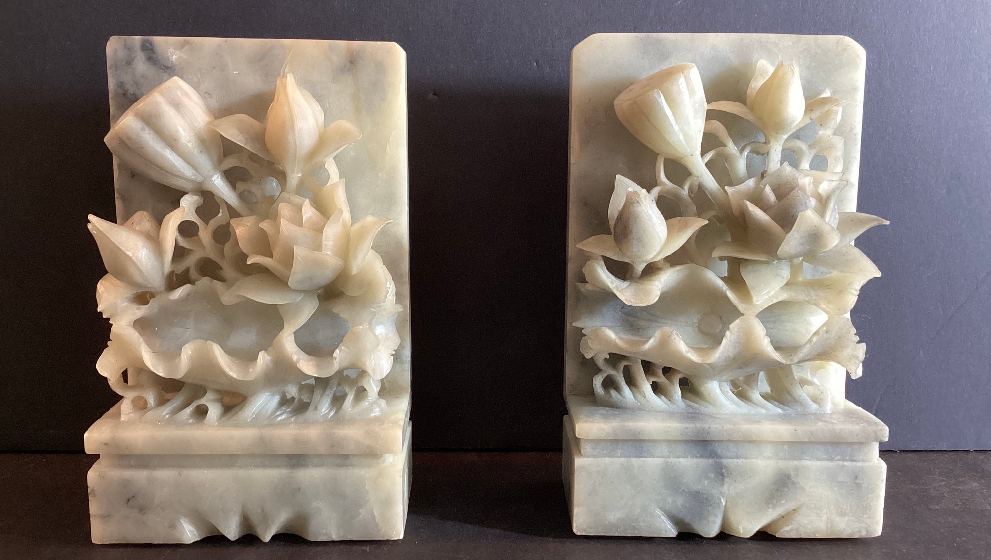 Each bookend is carved from a single piece of soapstone and has a beautiful design of a spent poppy bloom & other flowers and leaves coming into full bloom.
