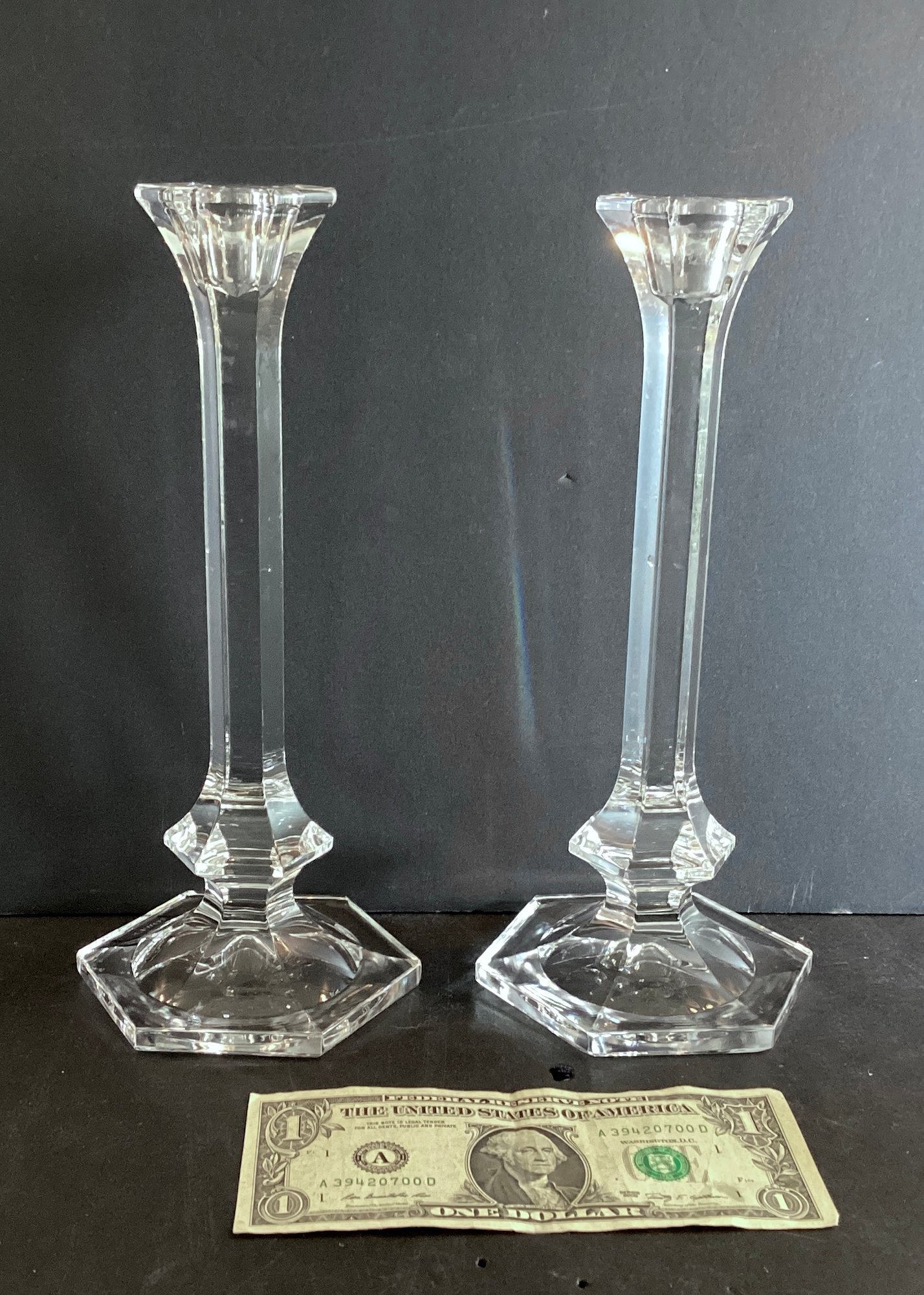 Here we have a pair of exceptionally nice towel crystal candleholders. The candleholders have an elegant design with a hexagon crystal base.