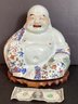 The Buddha is sitting in a serene pose and has painted colorful flowers in pink, rust, blues and greens and the Buddha’s mouth and ears have openings .