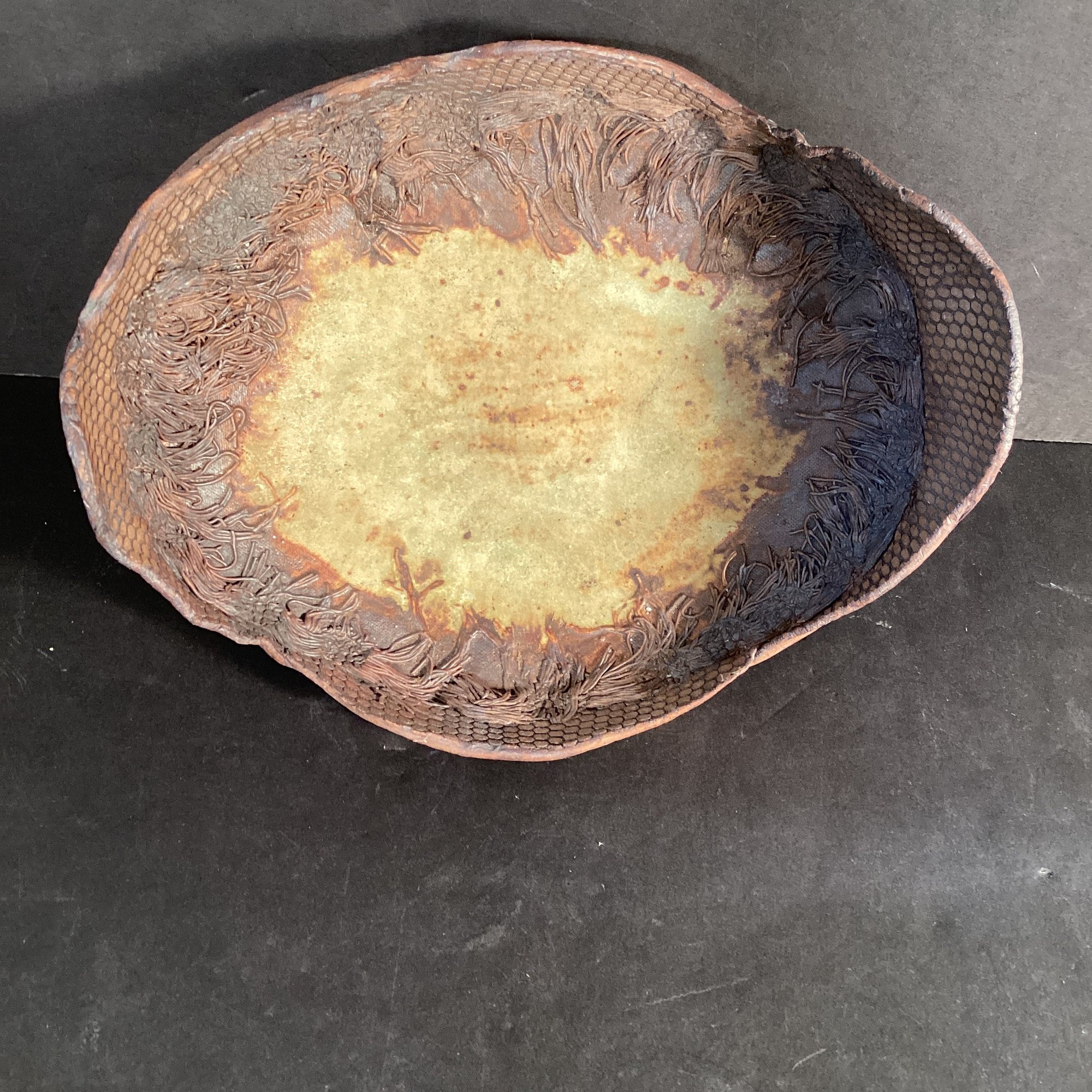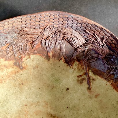 This has been created in tobacco brown with an interesting motif that is reminiscent of the shore and George Ohr.