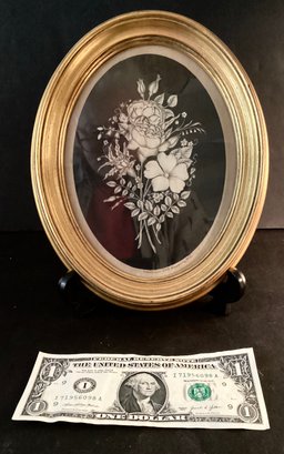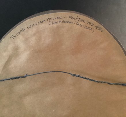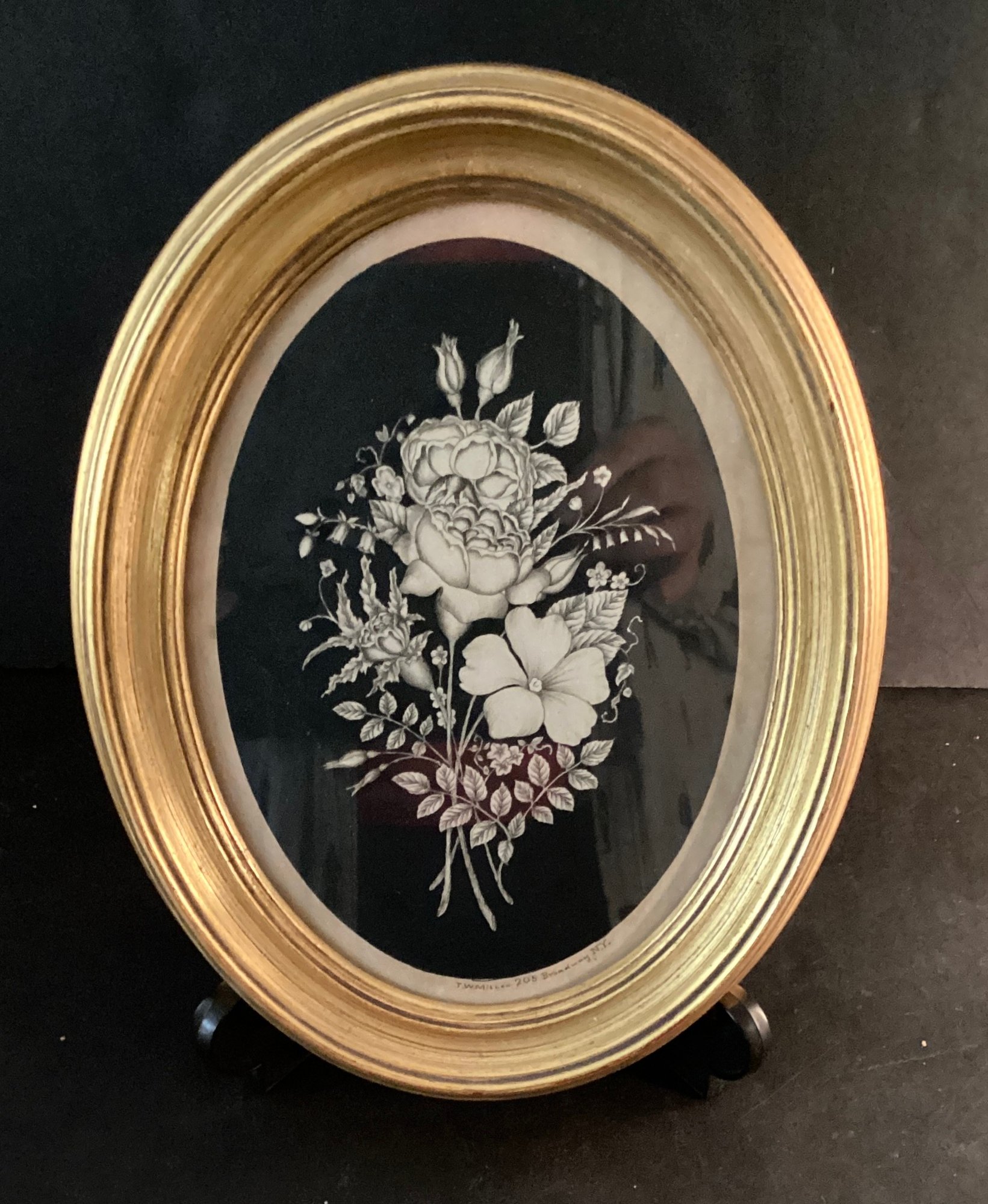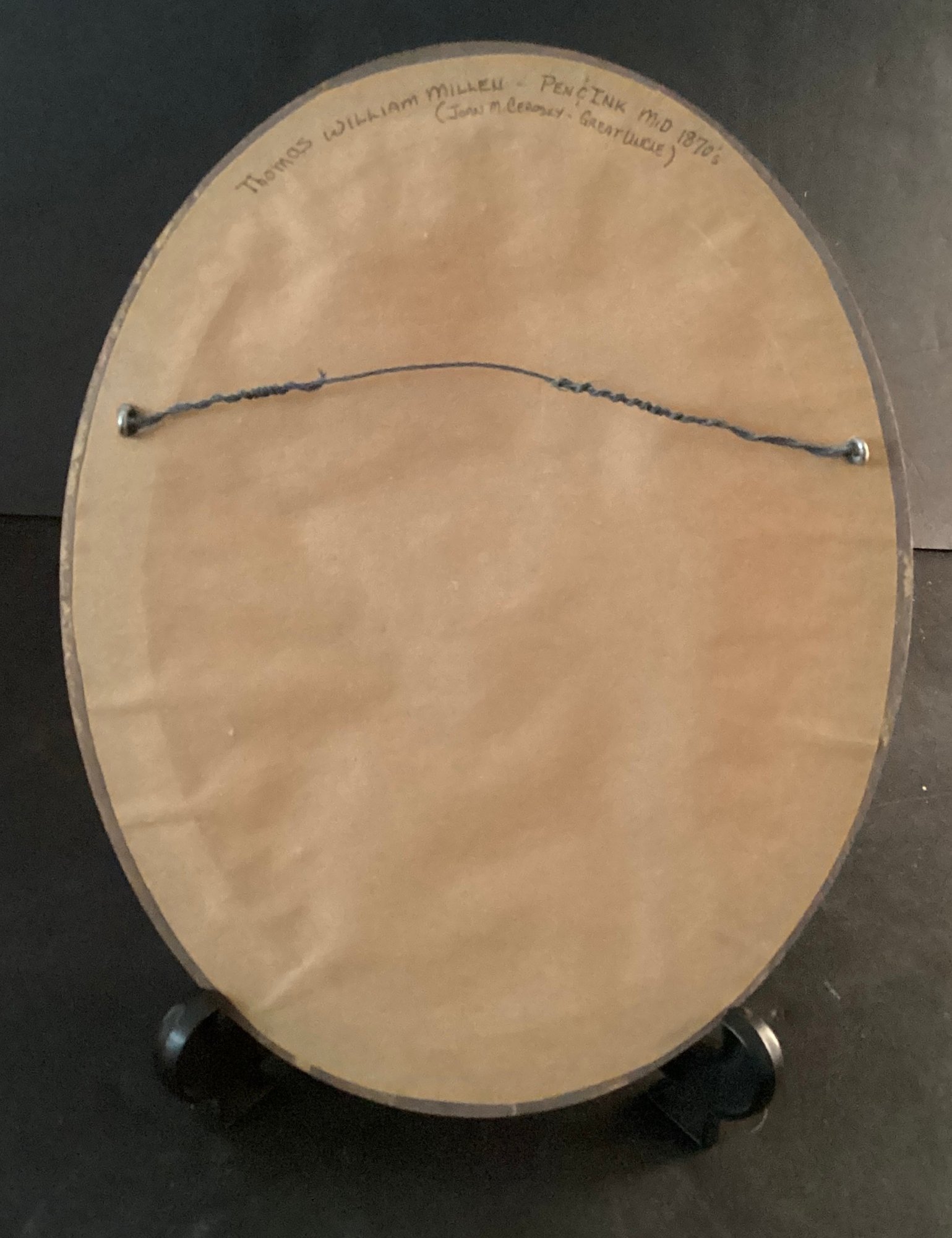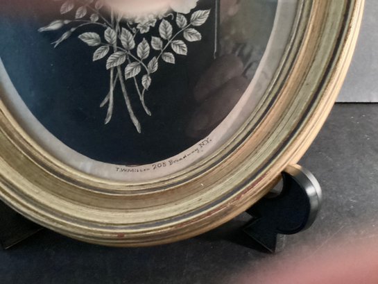 * This has been expertly drawn, with an original gilded frame, and paper backing, with white for hanging. The drawing with frame presents a 7” x 9” oval.