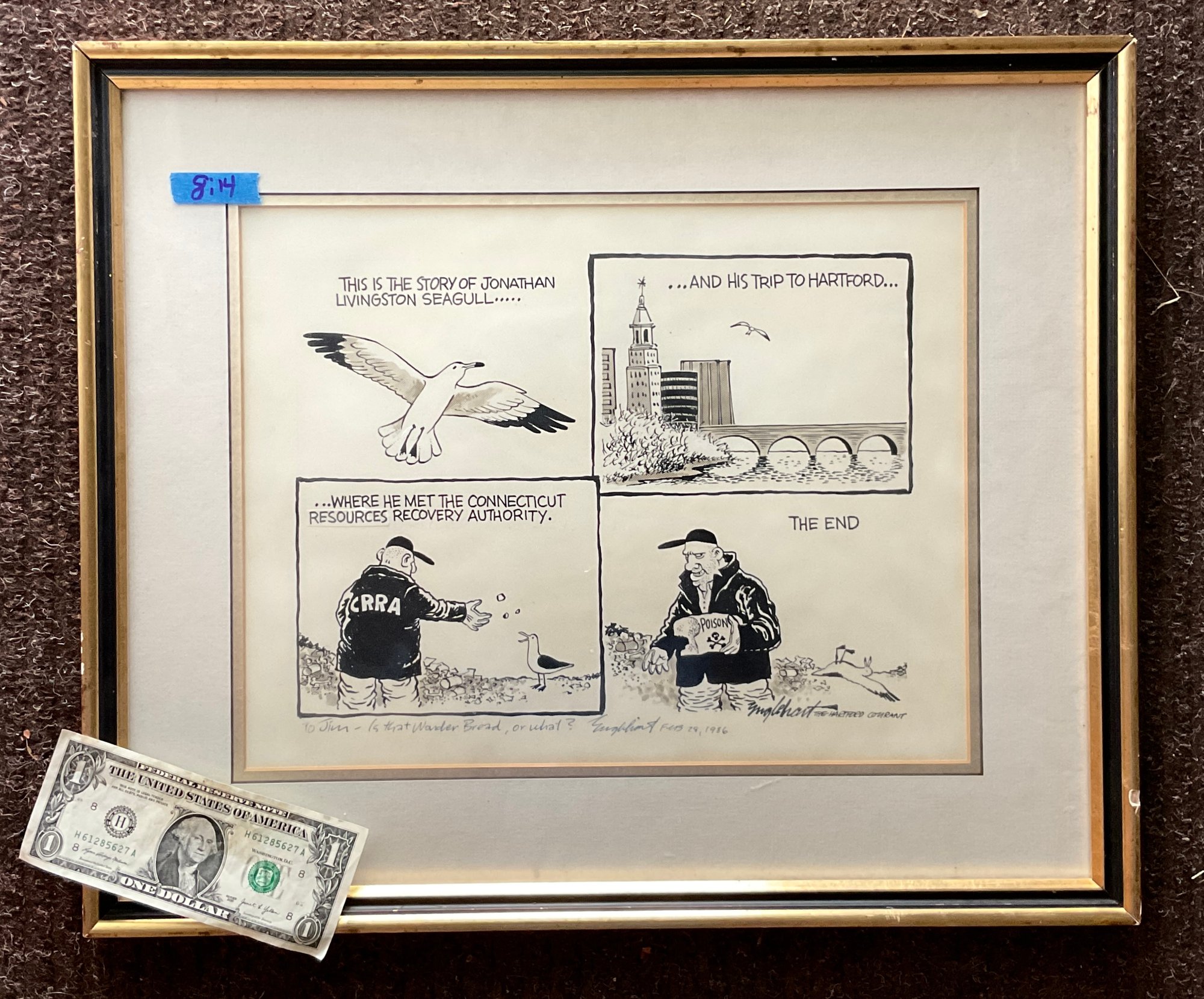 Here we have a very nice lithograph done by Bob Engelhart, a political cartoonist for the Hartford current. It was a gift to his friend Jim and his comment was is that underbred, or what? Signed in and dated lower left