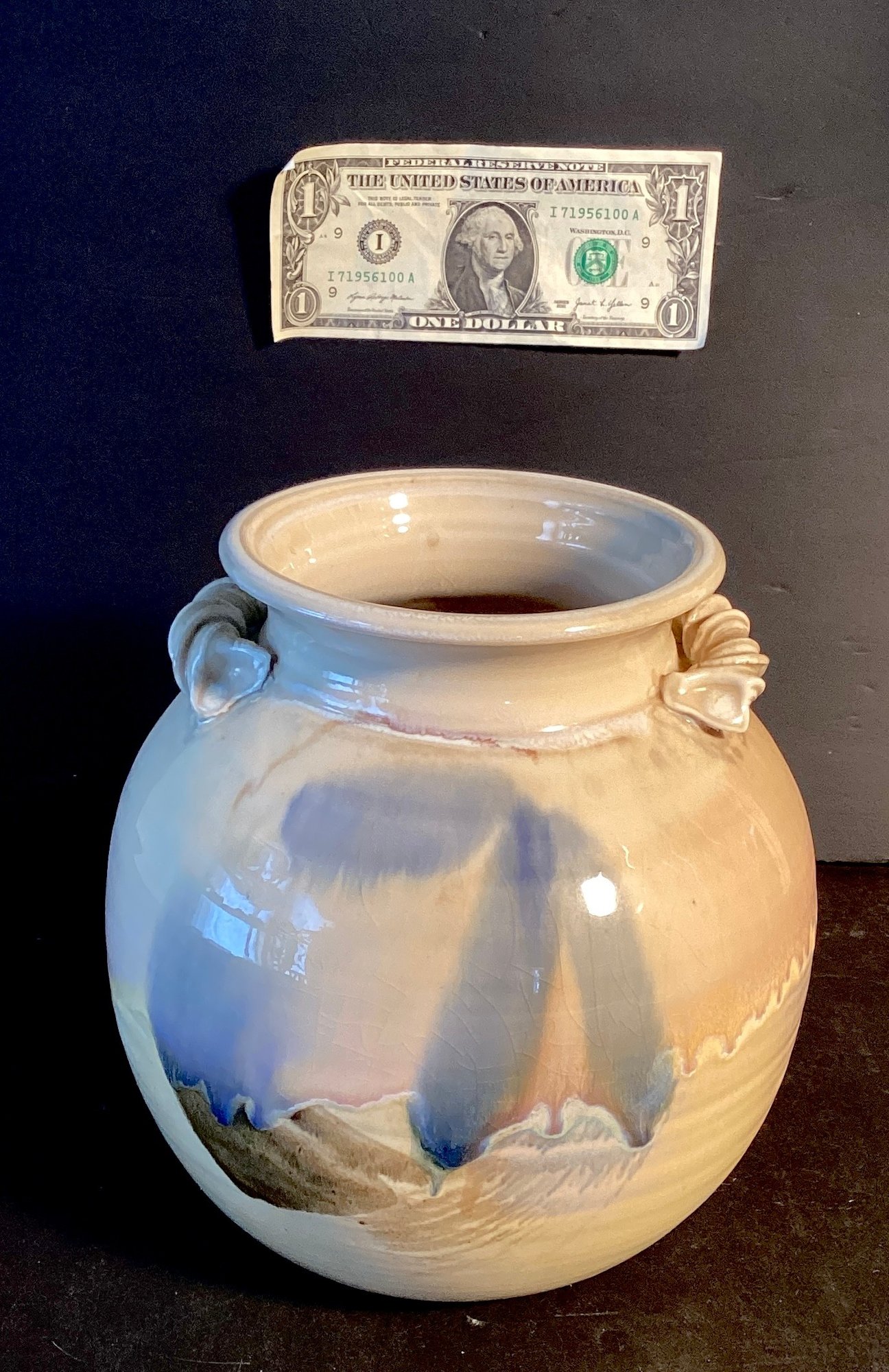 * this has both a matte glaze towards the. Are of this pot, and a high gloss glaze inside and at the top of the vase, with small me light crazing on the high gloss glaze.
