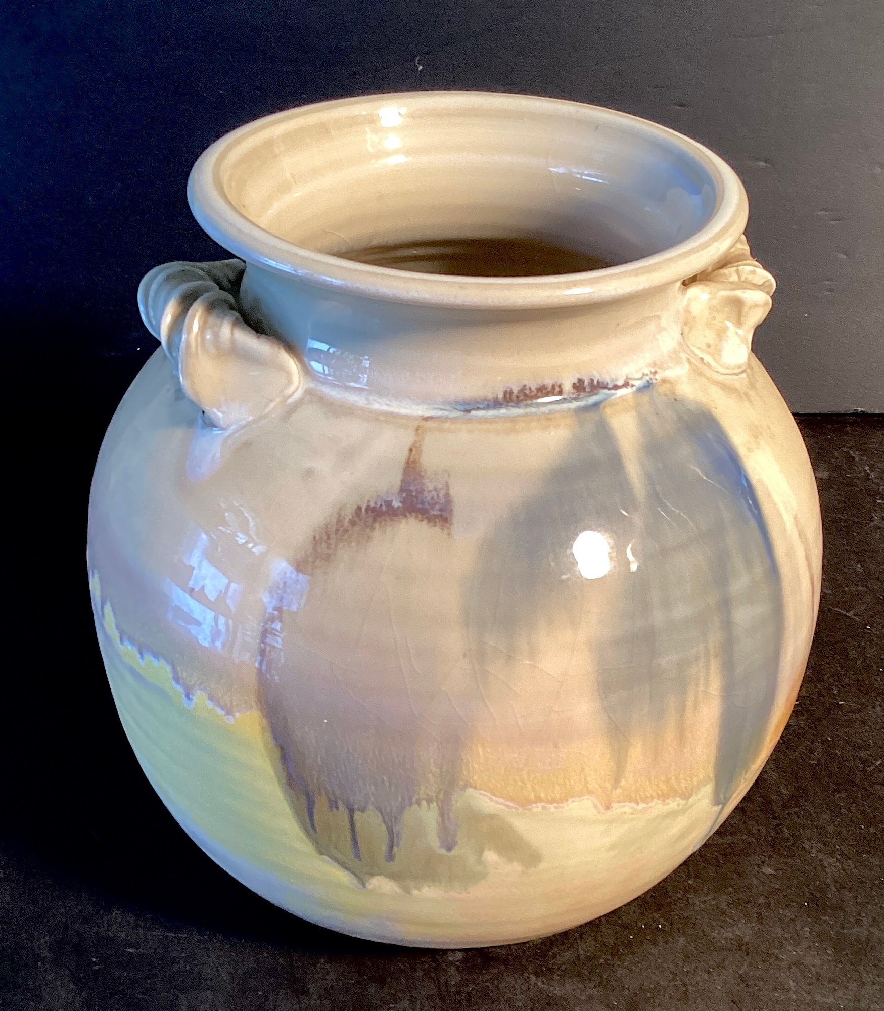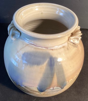 * glazed inside and out, pot has tones of smoky violet, peach and soft lemon tones.