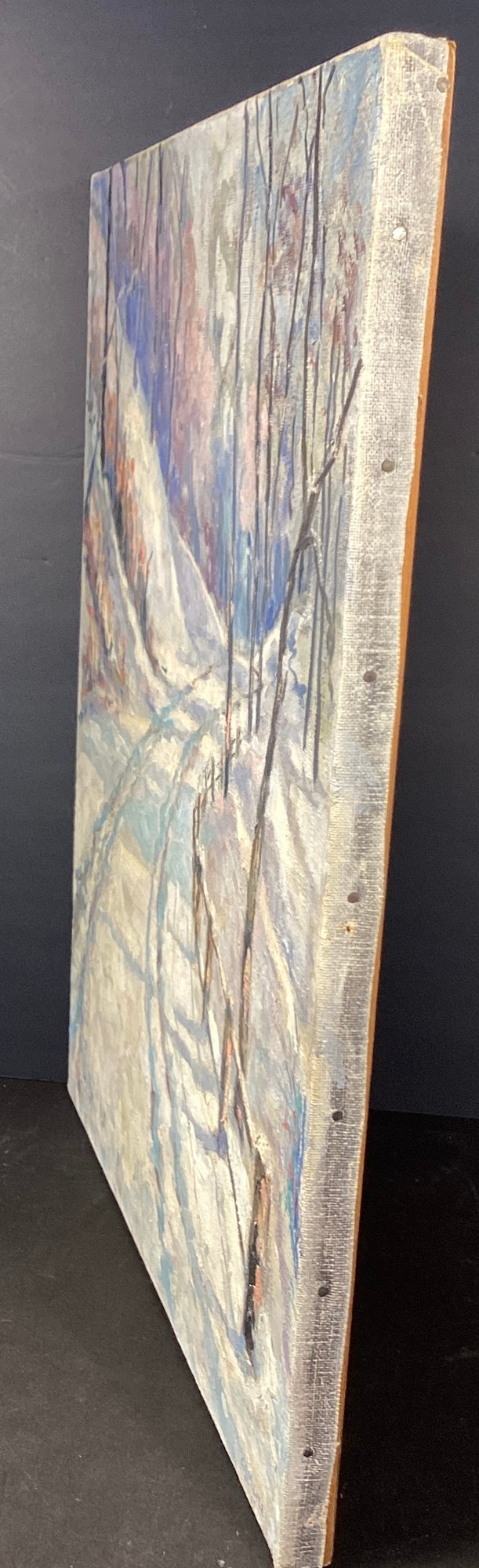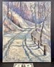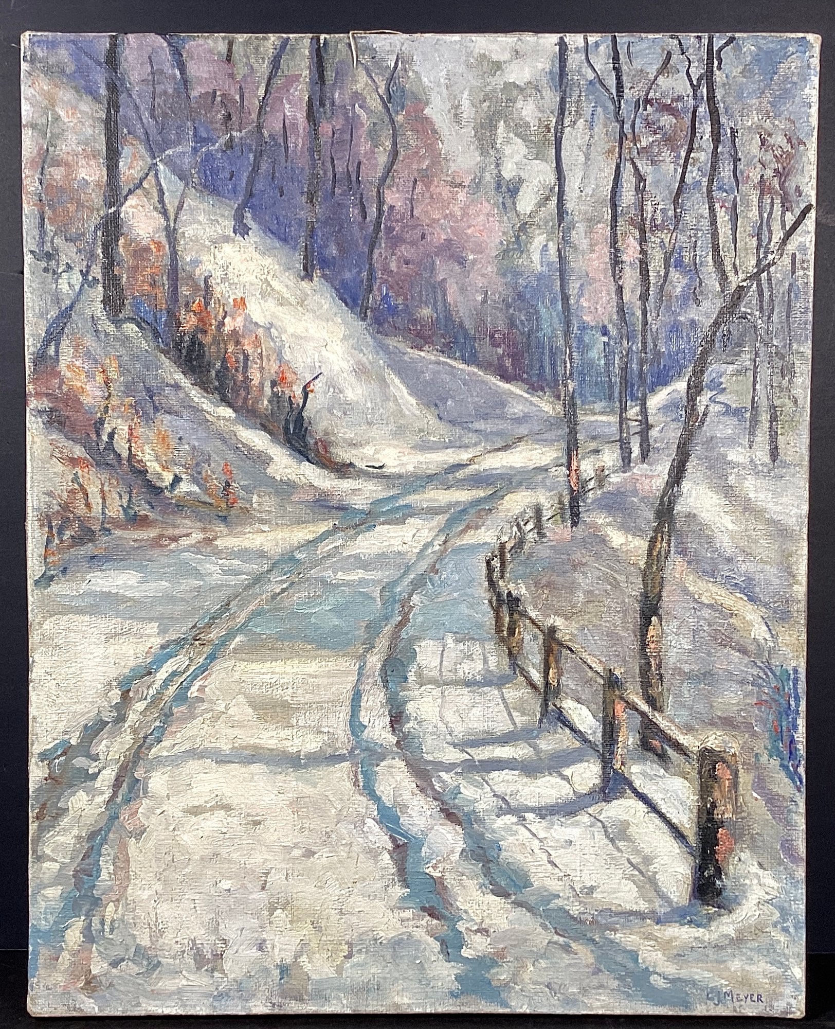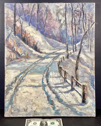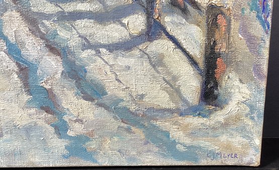 Here we have an exceptionally well done impressionistic oil painting by the artist, Carl Meyer. This painting depicts a walking trail that has newly fallen snow. The impressionistic style lens to the dream quality of this painting. This is done in shades of white, blues, plums, and soft pink.