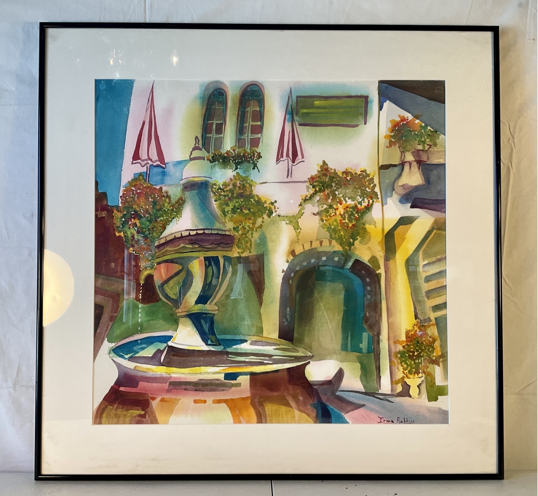 Original Mid Century watercolor of a court yard on paper with amazing colors and composition.a very good New Orleans Artist.