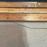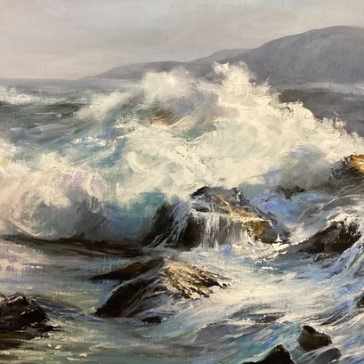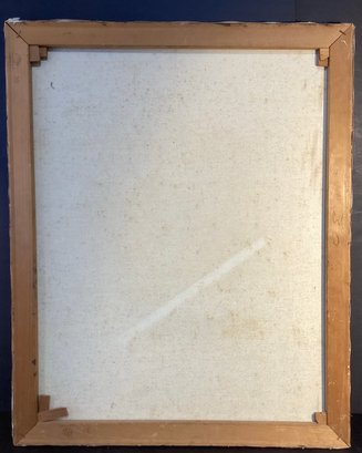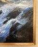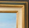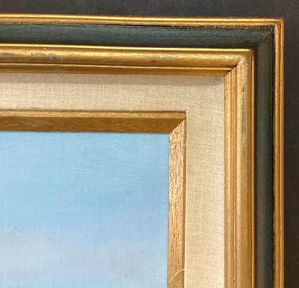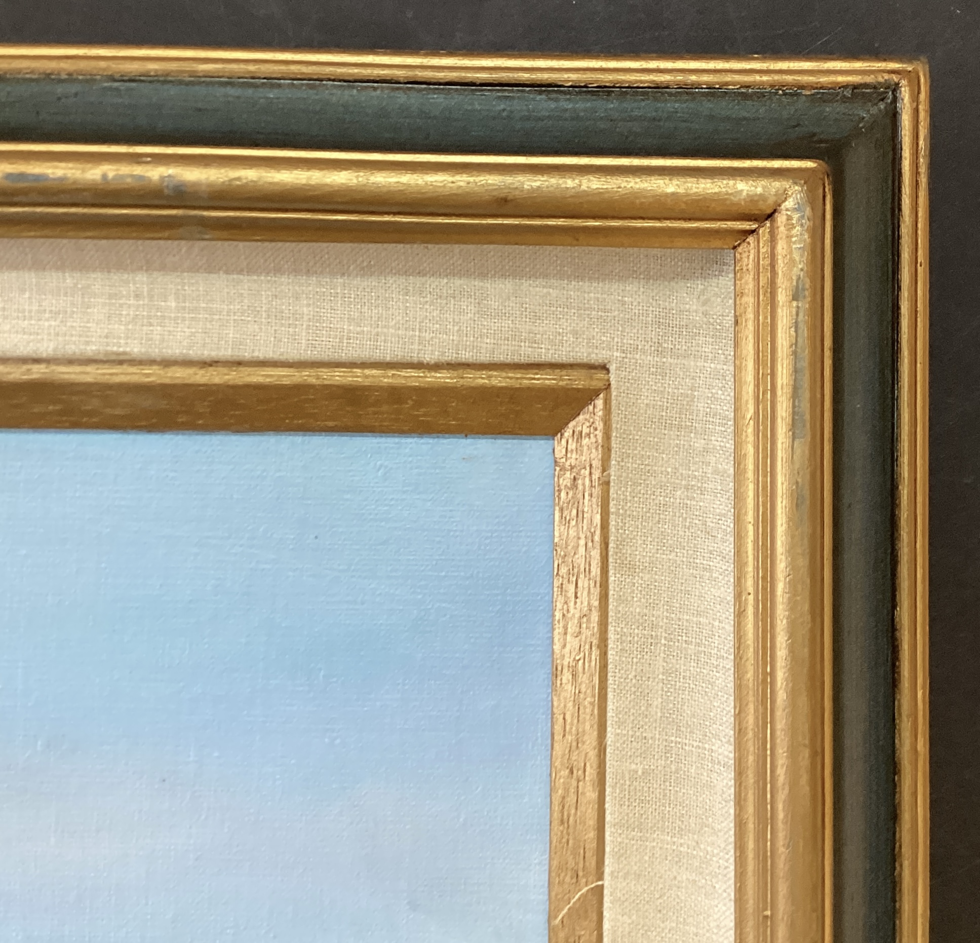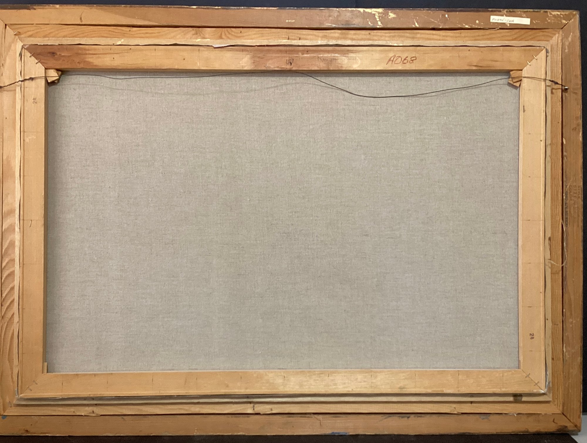 This is a large oil painting on artist canvas, which is on a wood stretcher, and then framed with an inner linen mat along with gilded wood and a marine blue frame.