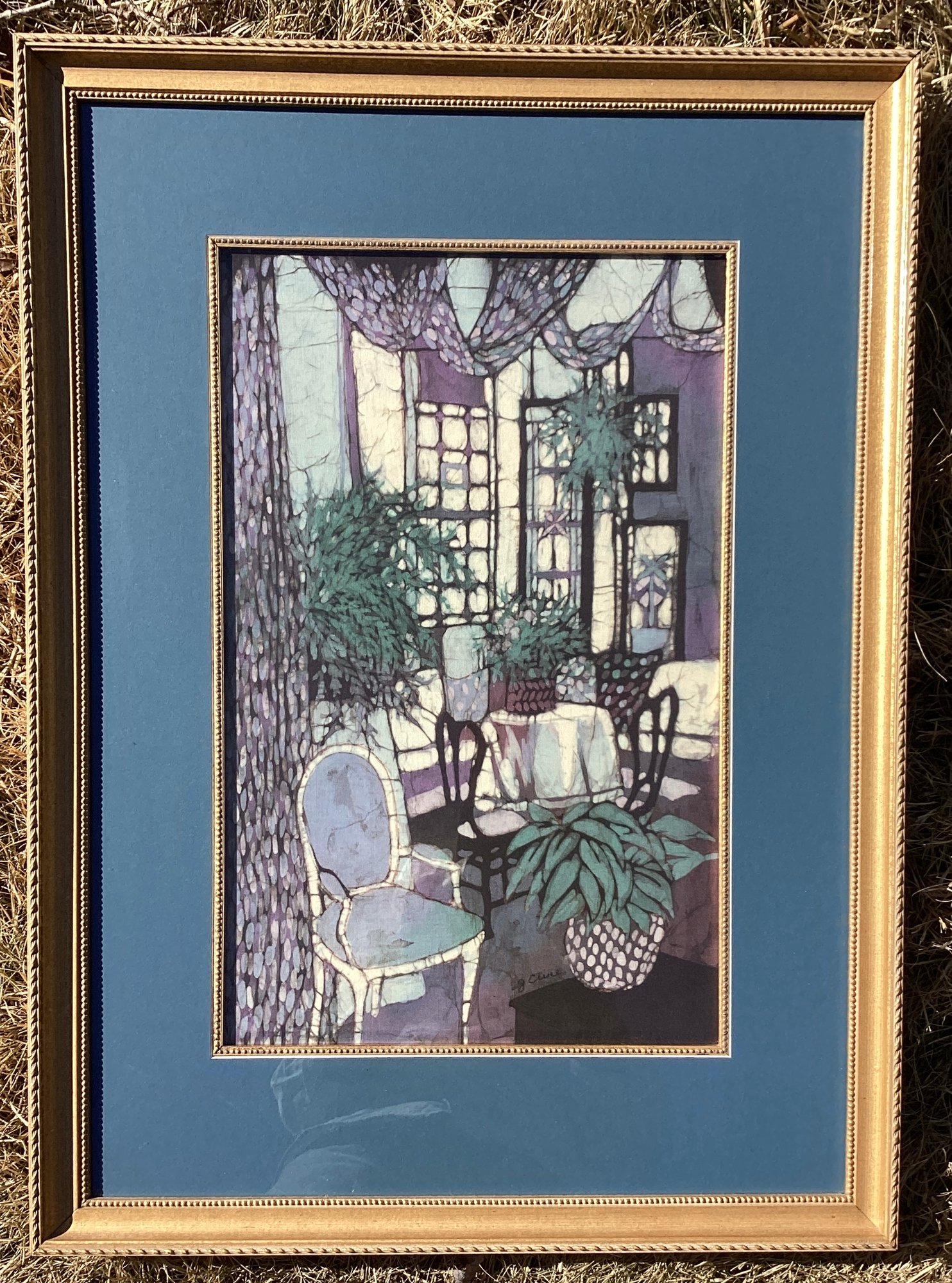 This print shows a lovely summer porch scene in shades of purples, greens, and cream/blue tones.