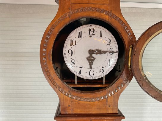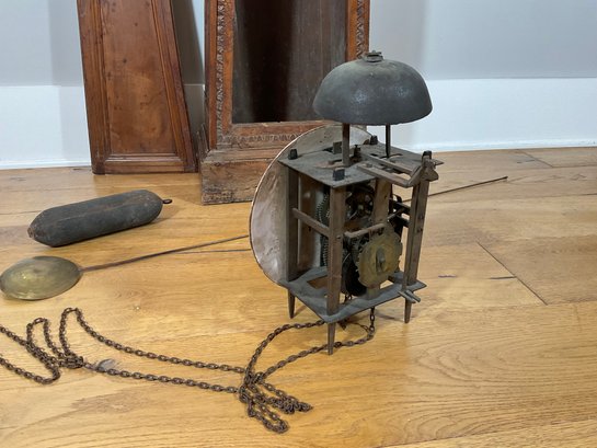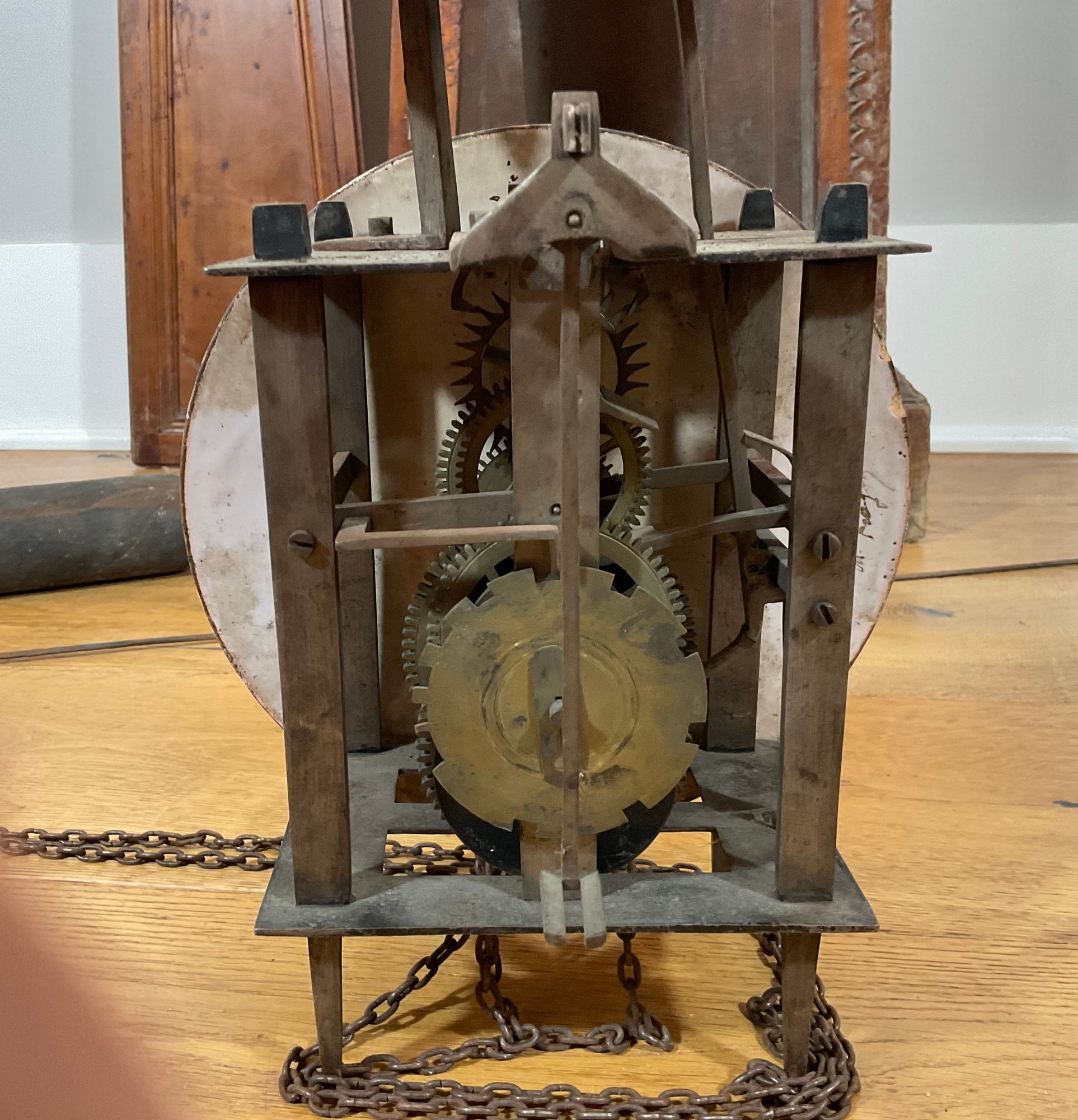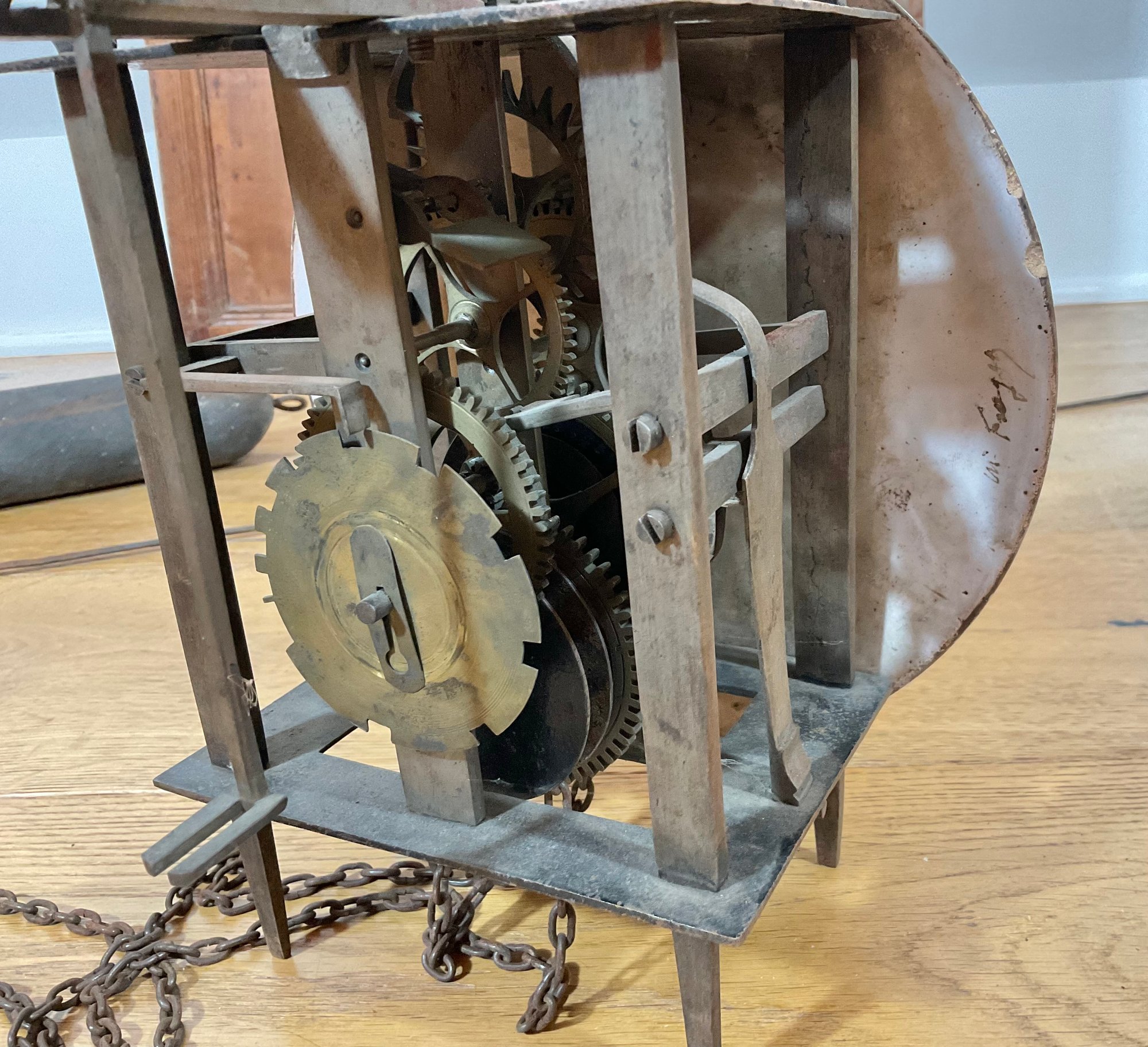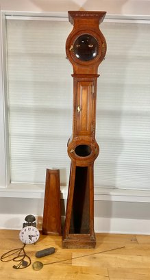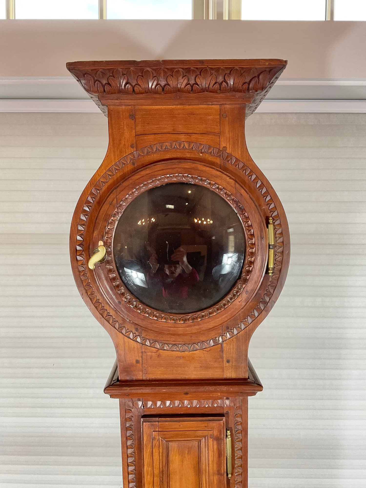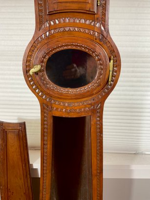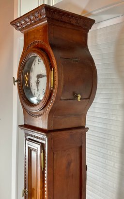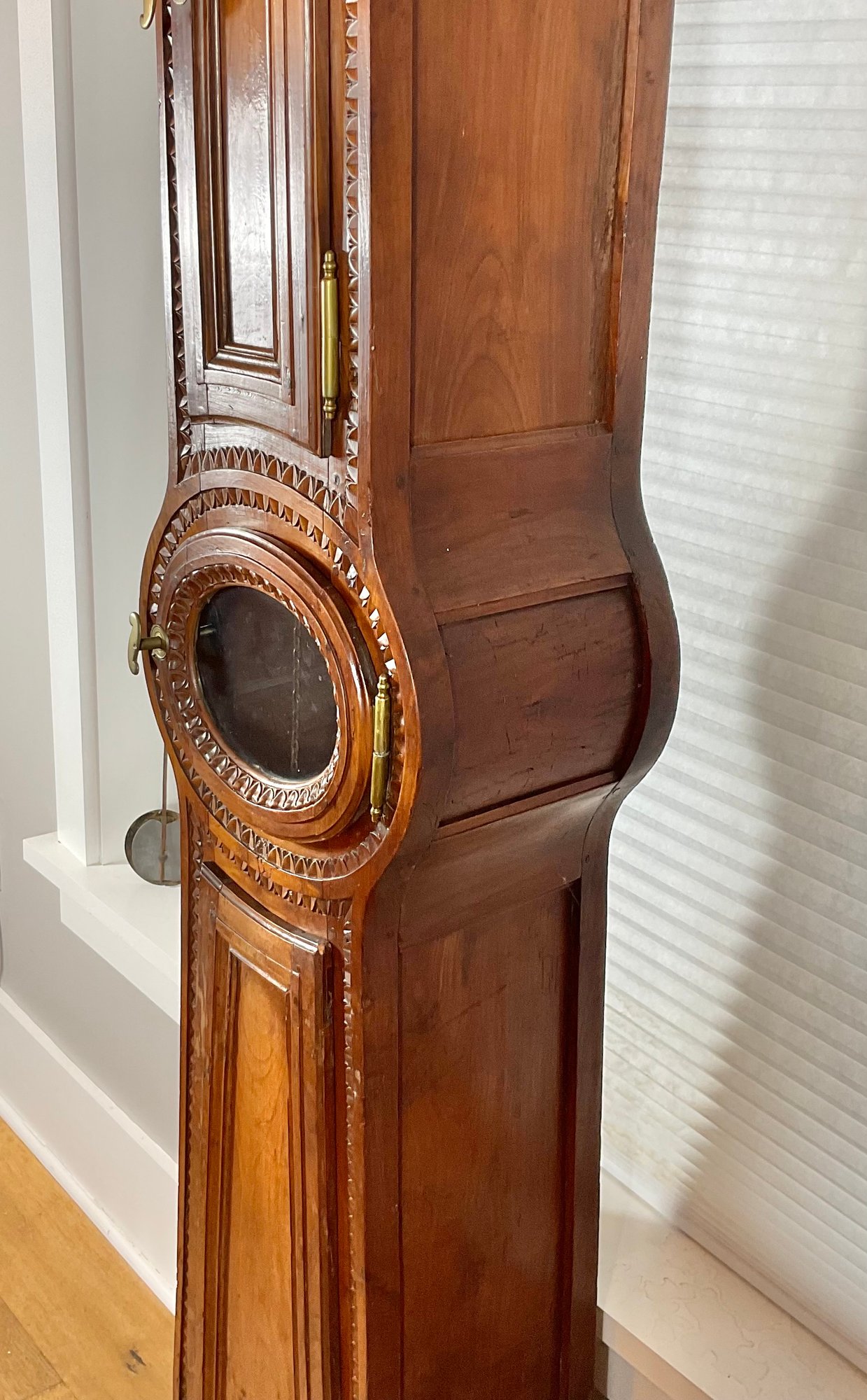 This walnut is from the 18th century and has the original works with a porcelain dial. On the back of the dial, there is a name (see pictures). Like this an eight day weight movement time and strike on the quarter hour the case is all original and the works are original to the case. Exquisitely carved. The patina has a rich glow you would expect from a clock of this style and age.