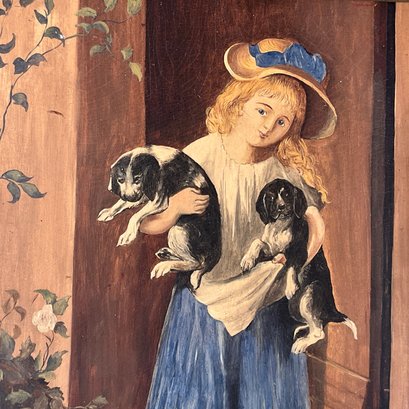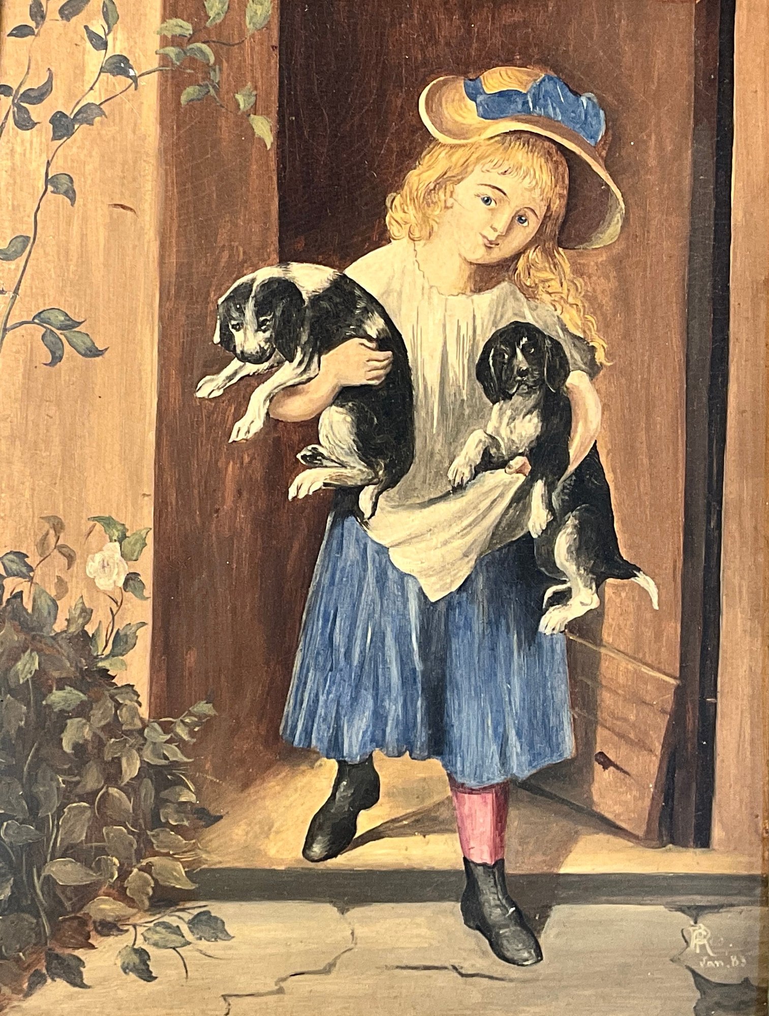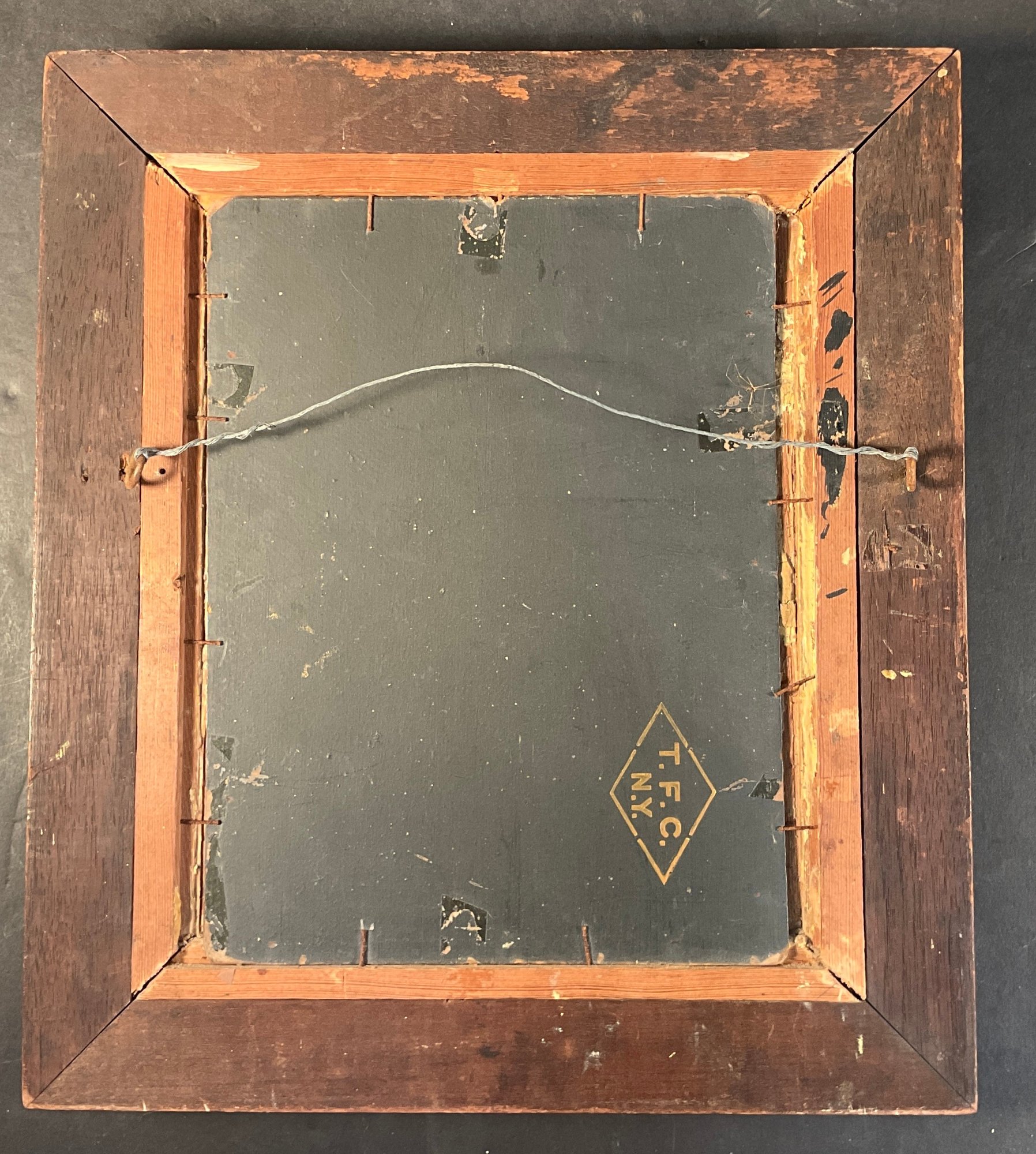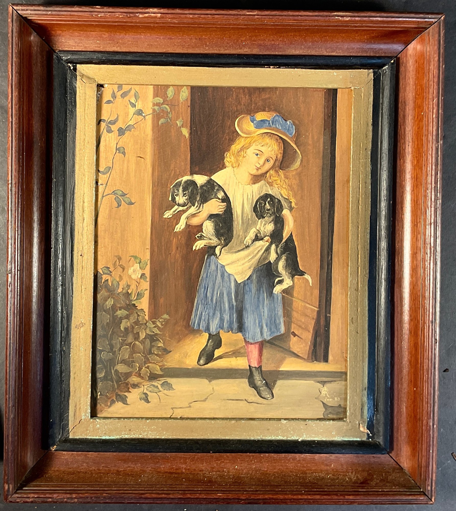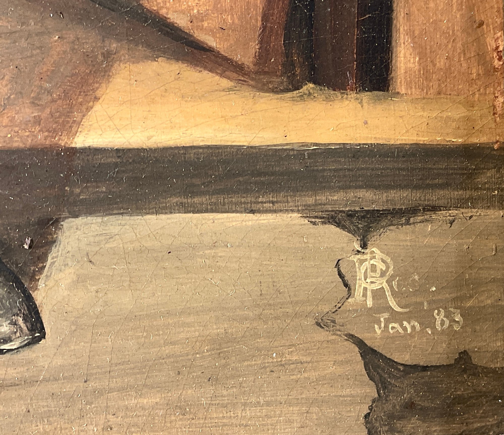 A very nice oil painting on board that has a monogram and the date of 83, I’m sure it’s 1883. In a nice Victorian deep solid walnut frame. Painting is well done and is in good overall condition
